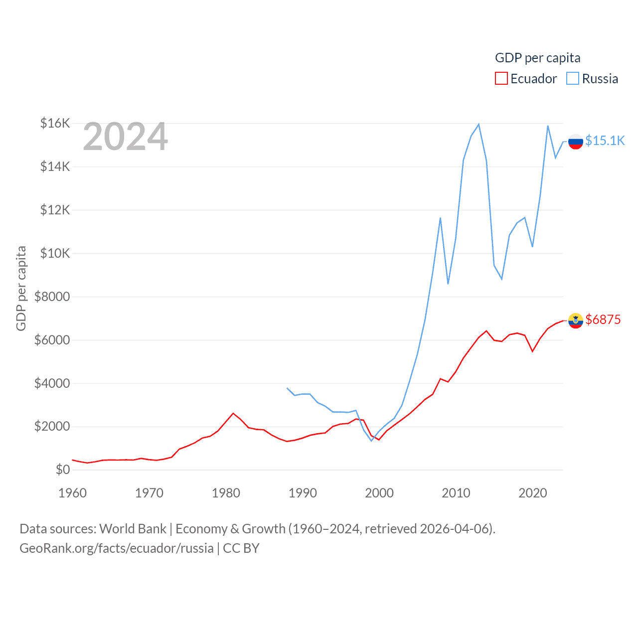 By GDP, Ecuador ranks 62/197 ($125B) and Russia ranks 11/197 ($2.17T). By GDP per capita, Ecuador ranks 103/197 ($6,875), while Russia ranks 68/197 ($15,145).