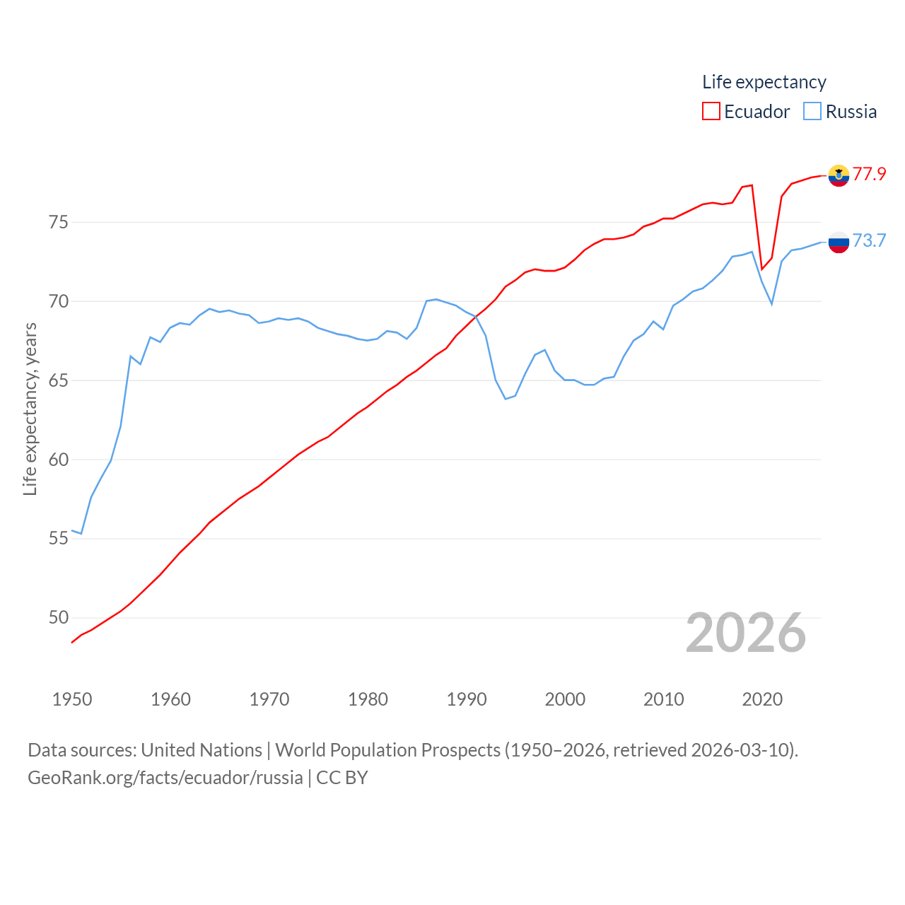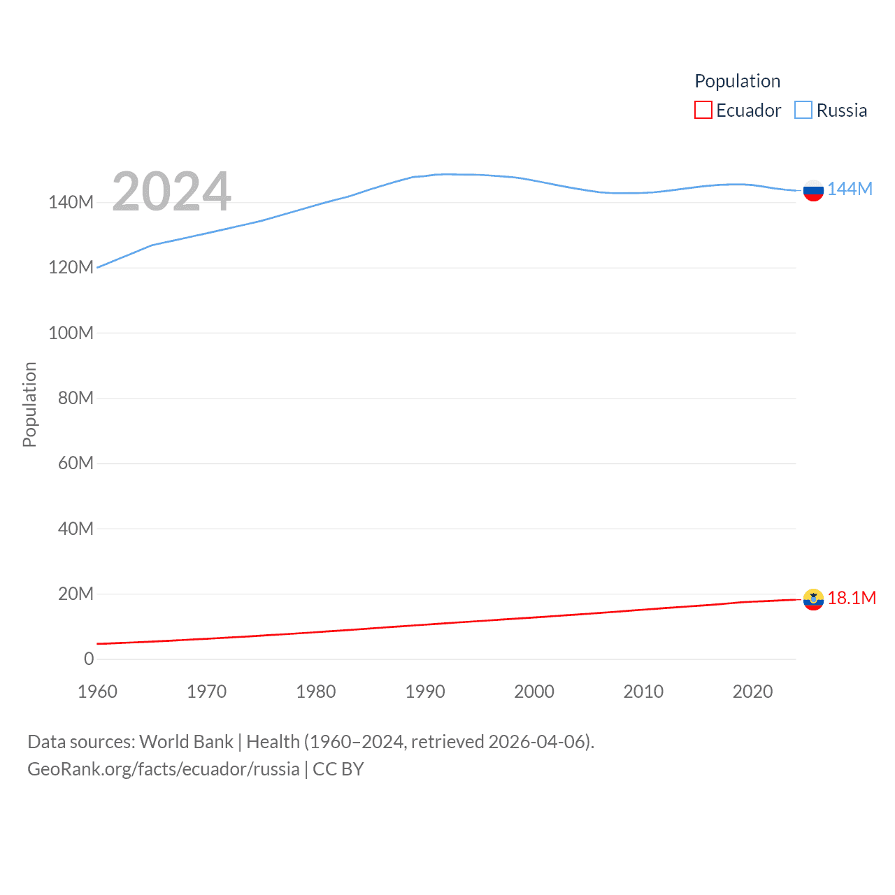 Ecuador has a population of 18.1M (ranked 71/197), compared with 144M in Russia (ranked 9/197). Ecuador's land area is 95,892 sq mi versus 6,323,145 sq mi for Russia (ranked 76th vs. 1st).