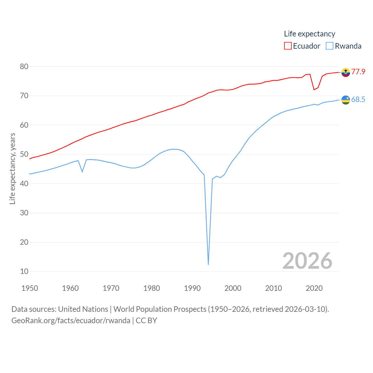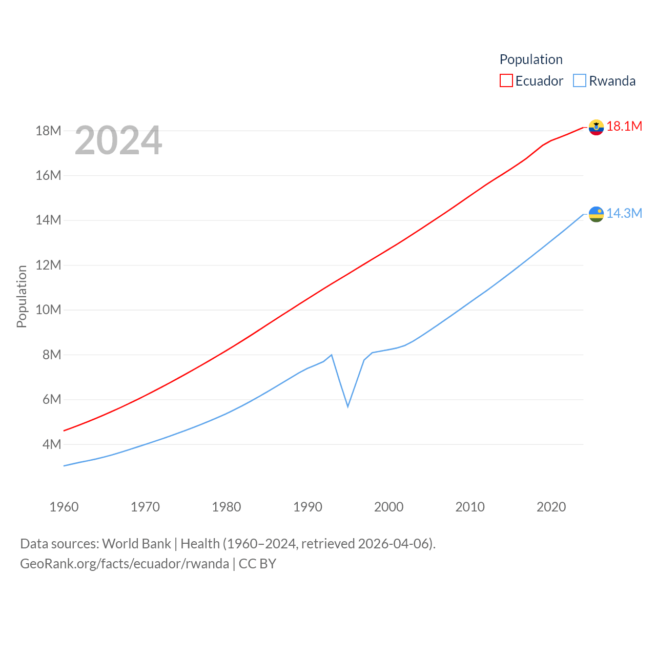 Ecuador has a population of 18.1M (ranked 71/197), compared with 14.3M in Rwanda (ranked 77/197). Ecuador's land area is 95,892 sq mi versus 9,525 sq mi for Rwanda (ranked 76th vs. 146th).