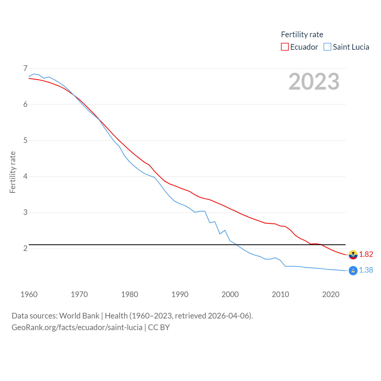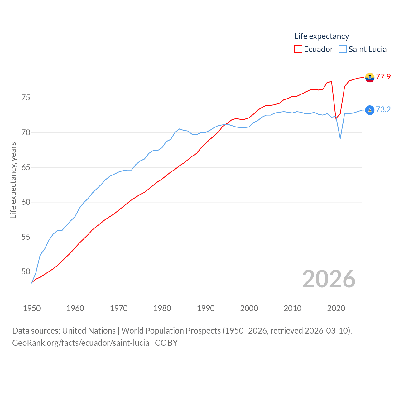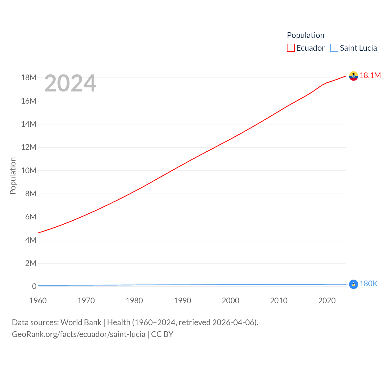 Ecuador has a population of 18.1M (ranked 71/197), compared with 180K in Saint Lucia (ranked 178/197). Ecuador's land area is 95,892 sq mi versus 235.5 sq mi for Saint Lucia (ranked 76th vs. 178th).