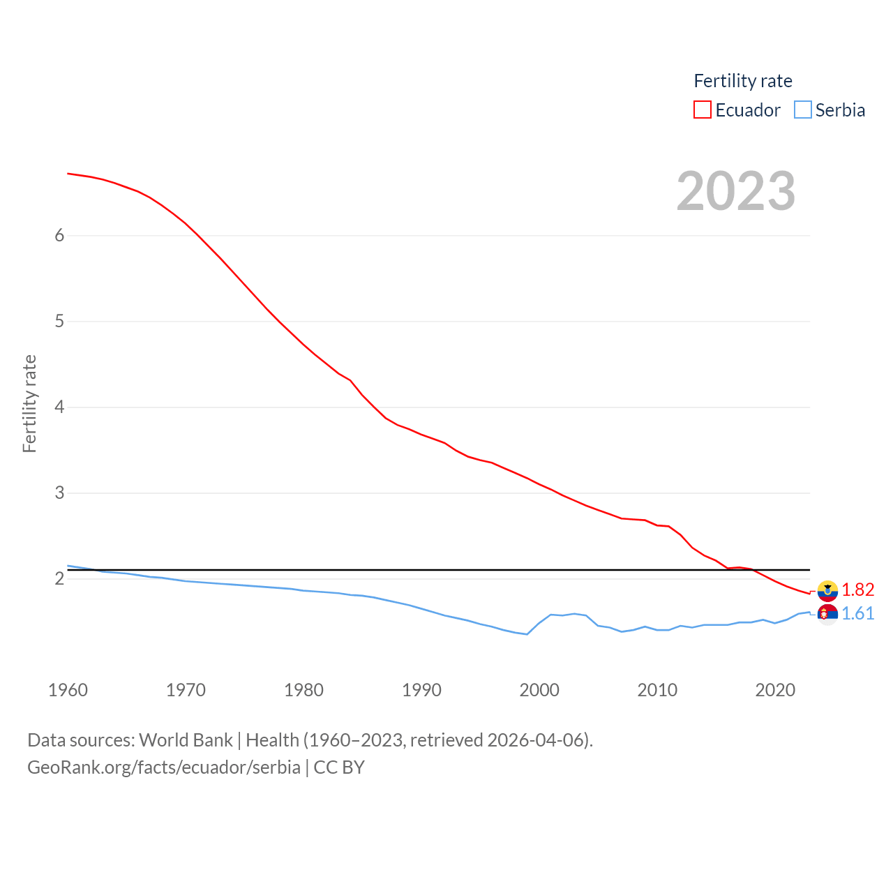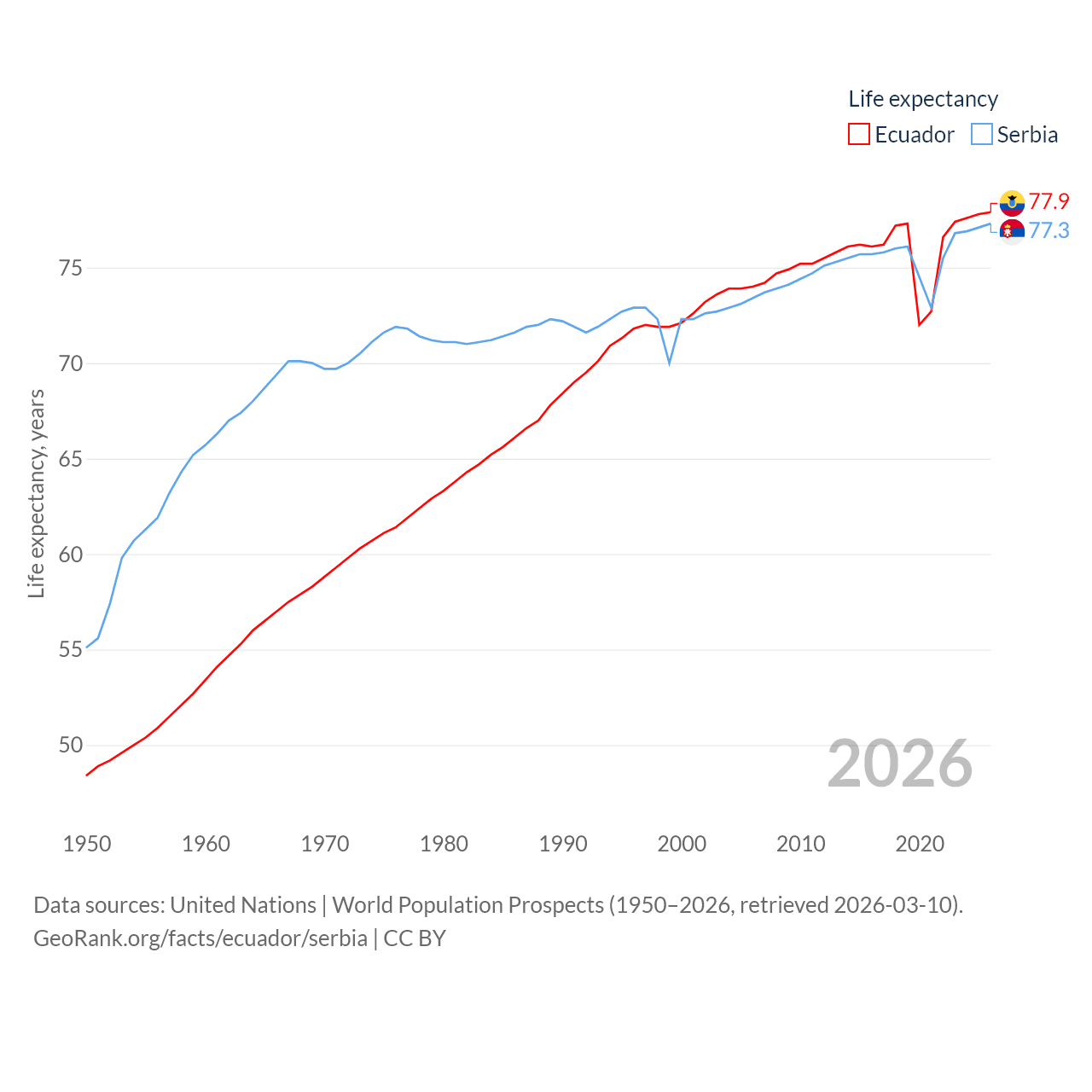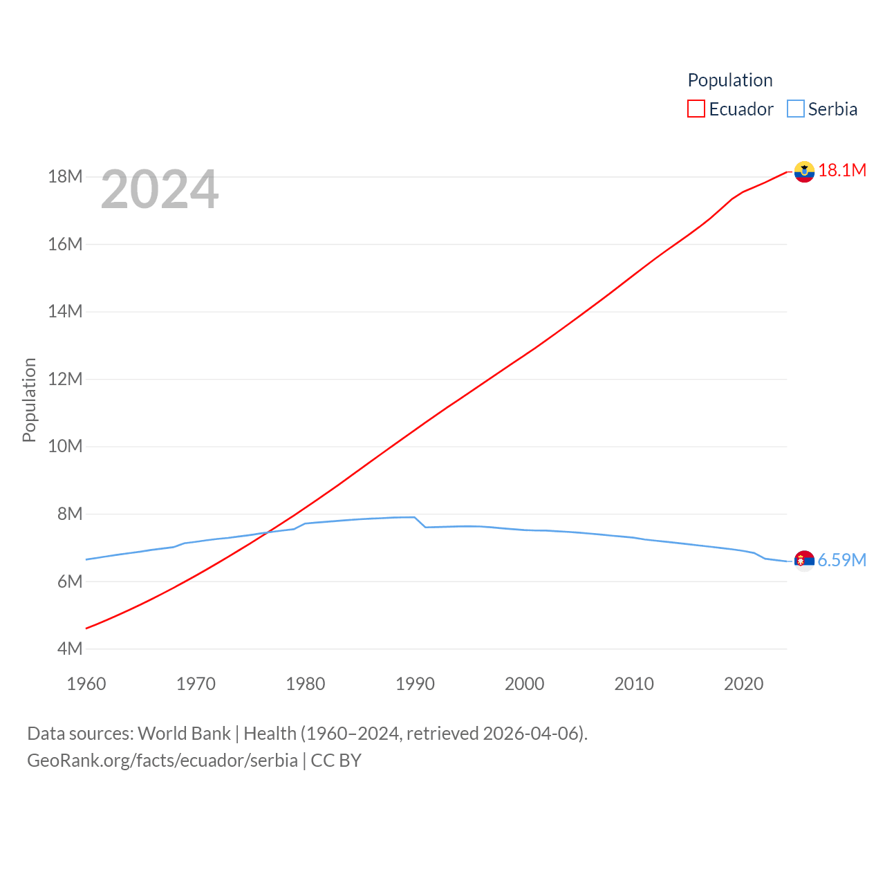Ecuador has a population of 18.1M (ranked 71/197), compared with 6.59M in Serbia (ranked 109/197). Ecuador's land area is 95,892 sq mi versus 32,467 sq mi for Serbia (ranked 76th vs. 111th).