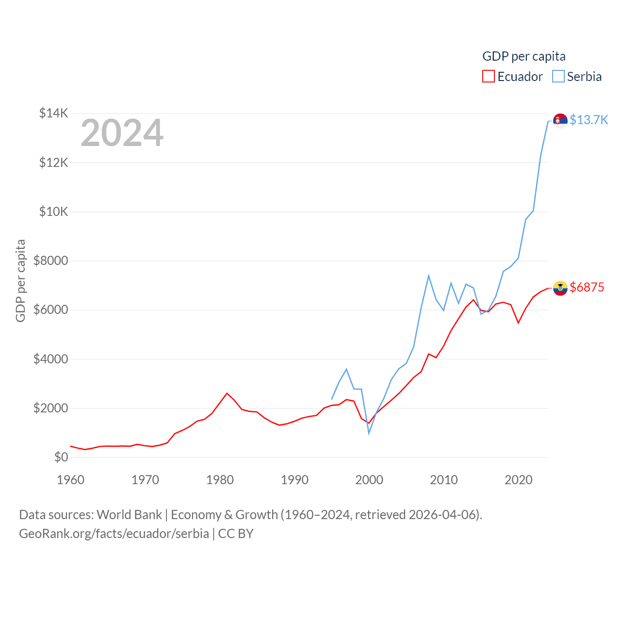 By GDP, Ecuador ranks 62/197 ($125B) and Serbia ranks 76/197 ($90.1B). By GDP per capita, Ecuador ranks 103/197 ($6,875), while Serbia ranks 73/197 ($13,679).