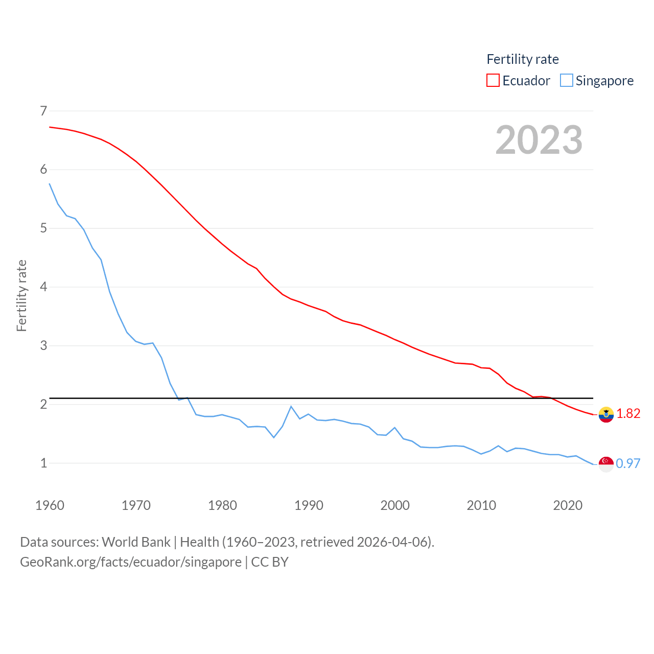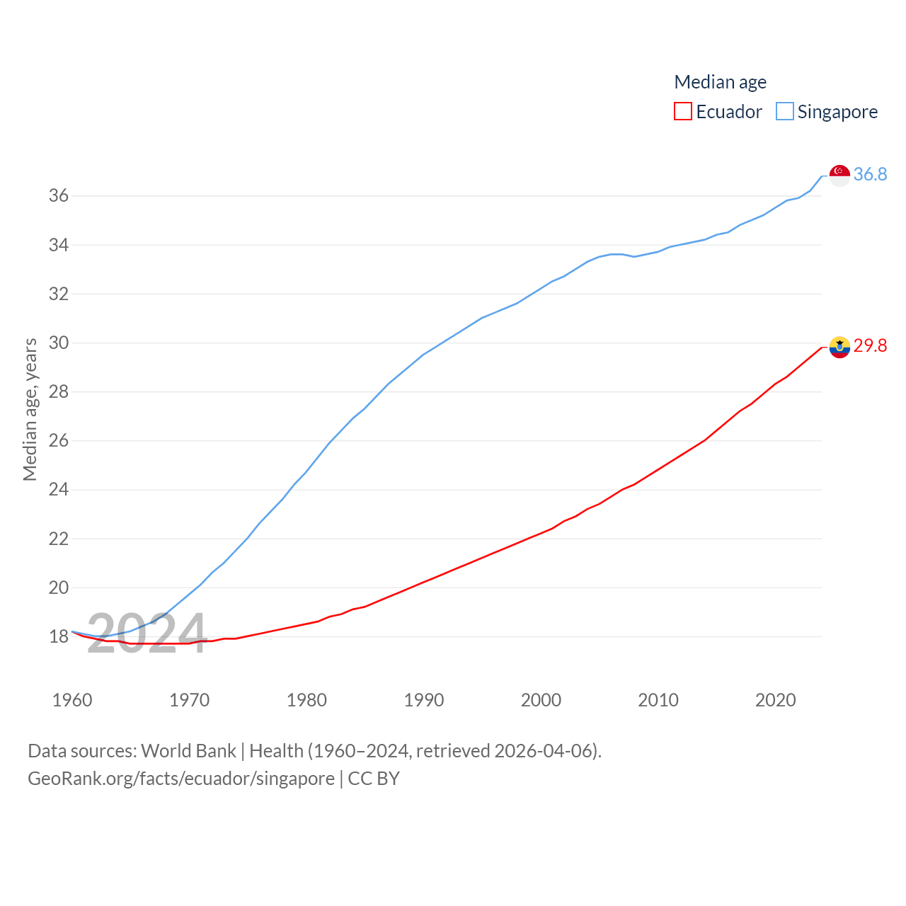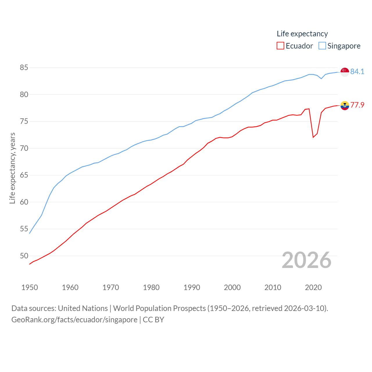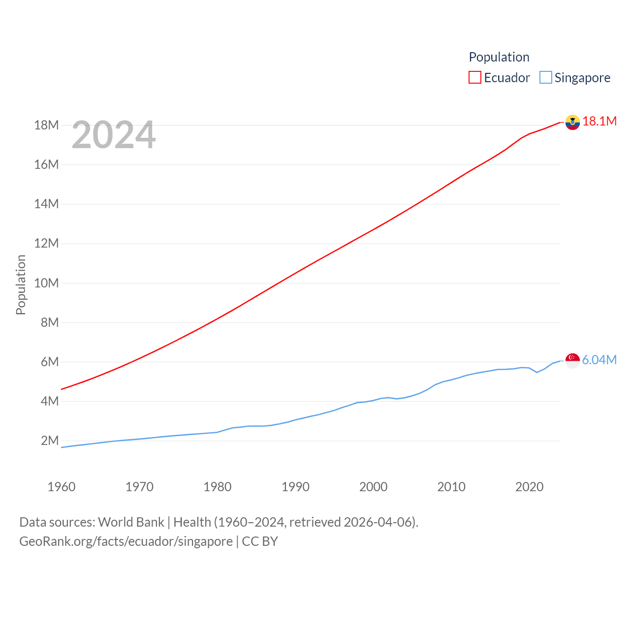 Ecuador has a population of 18.1M (ranked 71/197), compared with 6.04M in Singapore (ranked 113/197). Ecuador's land area is 95,892 sq mi versus 277.2 sq mi for Singapore (ranked 76th vs. 177th).