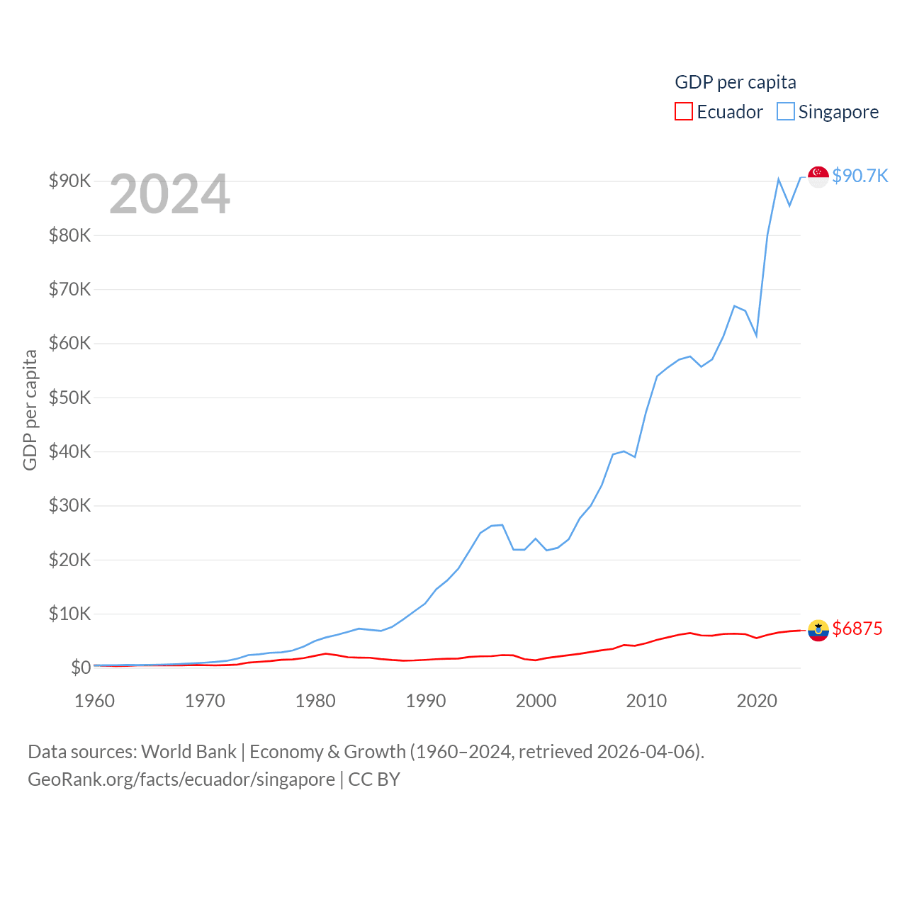 By GDP, Ecuador ranks 62/197 ($125B) and Singapore ranks 28/197 ($547B). By GDP per capita, Ecuador ranks 103/197 ($6,875), while Singapore ranks 7/197 ($90,674).