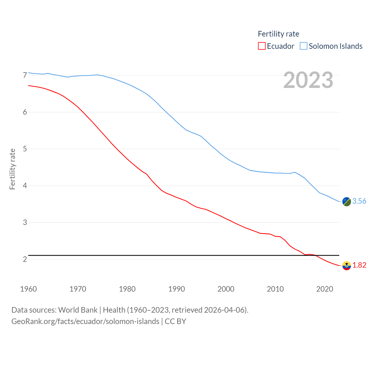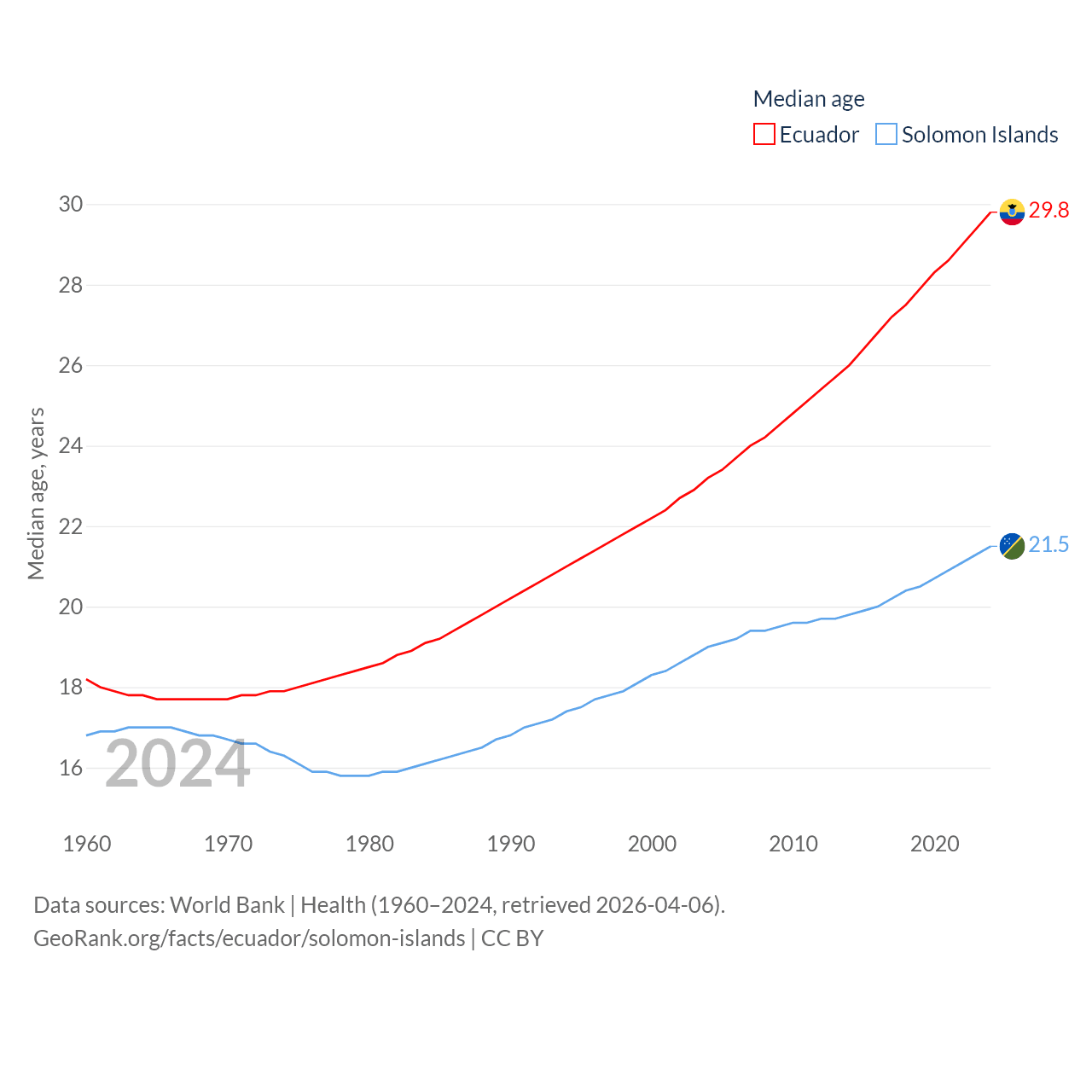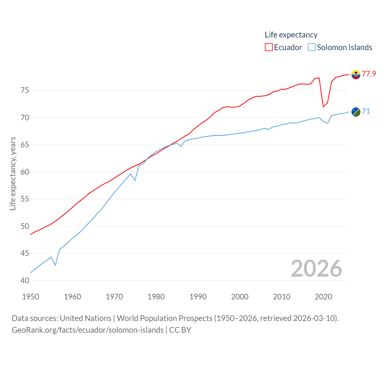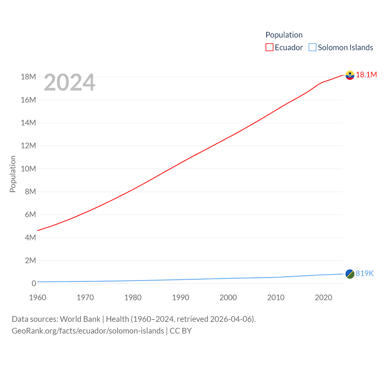 Ecuador has a population of 18.1M (ranked 71/197), compared with 819K in The Solomon Islands (ranked 162/197). Ecuador's land area is 95,892 sq mi versus 10,807 sq mi for The Solomon Islands (ranked 76th vs. 141st).