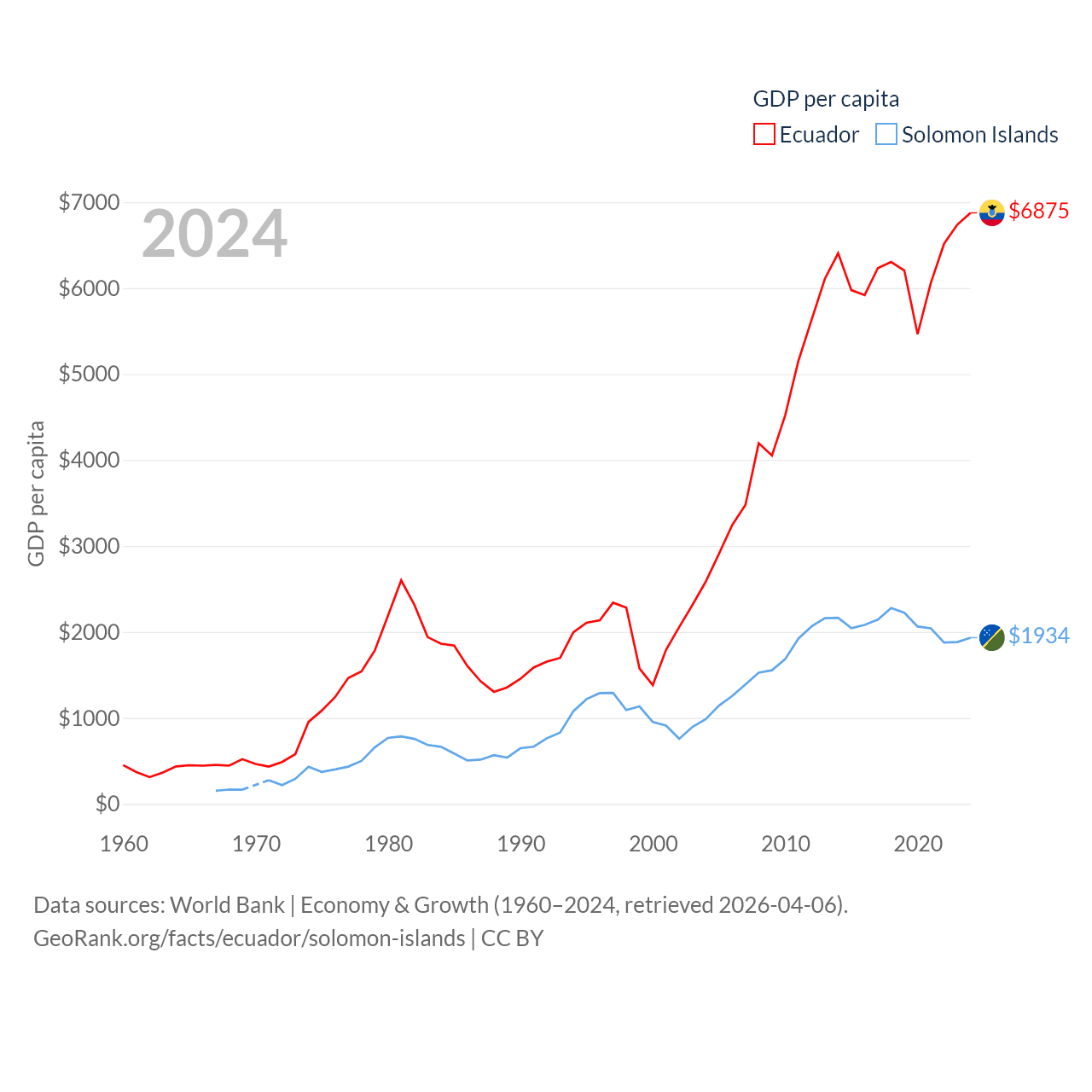 By GDP, Ecuador ranks 62/197 ($125B) and The Solomon Islands ranks 182/197 ($1.58B). By GDP per capita, Ecuador ranks 103/197 ($6,875), while The Solomon Islands ranks 157/197 ($1,934).