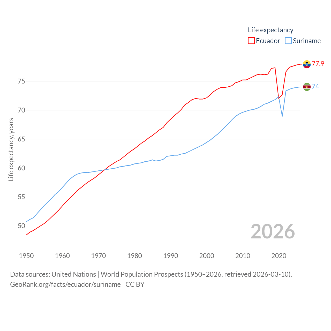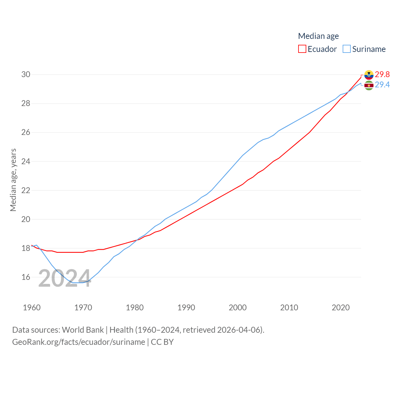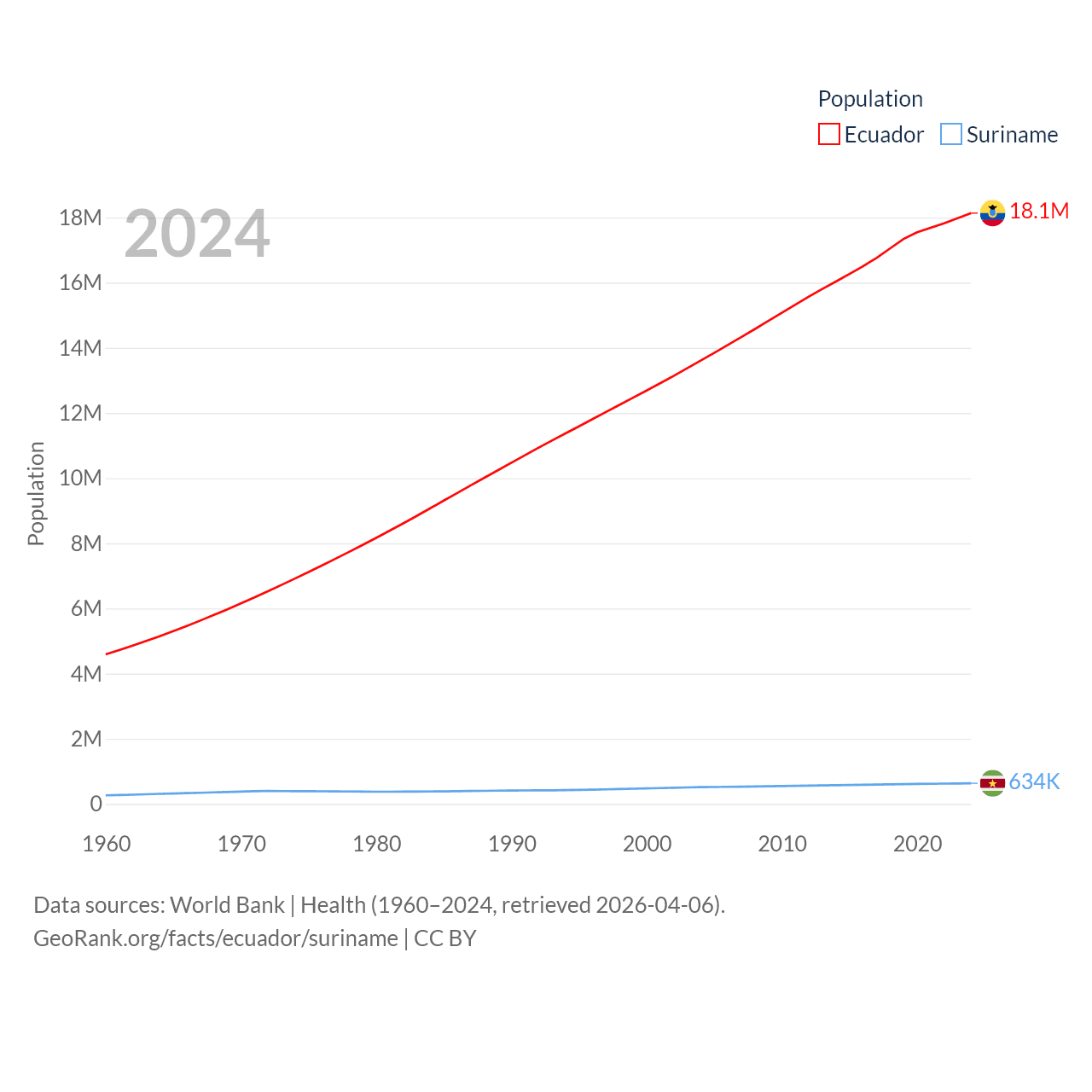 Ecuador has a population of 18.1M (ranked 71/197), compared with 634K in Suriname (ranked 165/197). Ecuador's land area is 95,892 sq mi versus 61,972 sq mi for Suriname (ranked 76th vs. 90th).