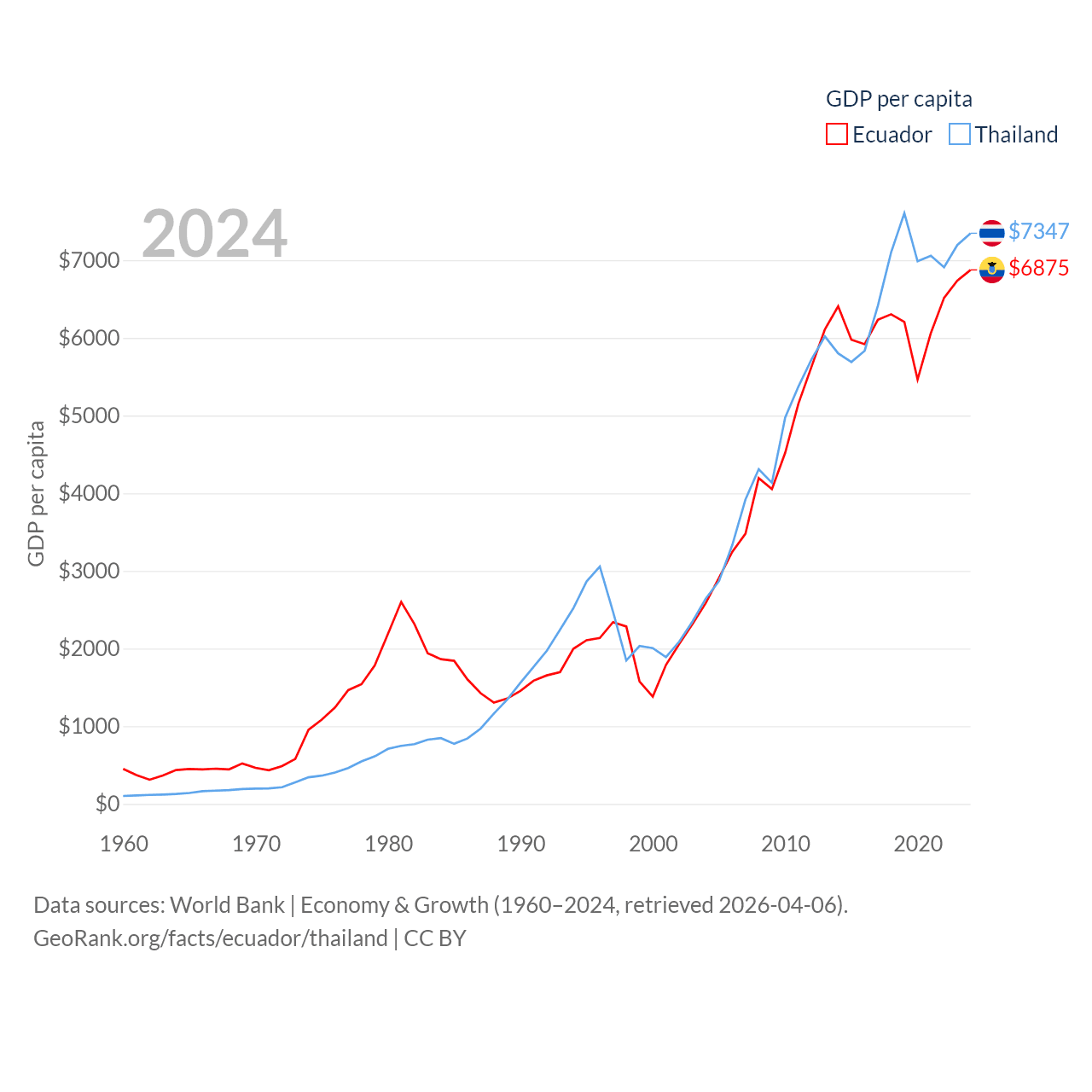 By GDP, Ecuador ranks 62/197 ($125B) and Thailand ranks 31/197 ($527B). By GDP per capita, Ecuador ranks 103/197 ($6,875), while Thailand ranks 100/197 ($7,347).