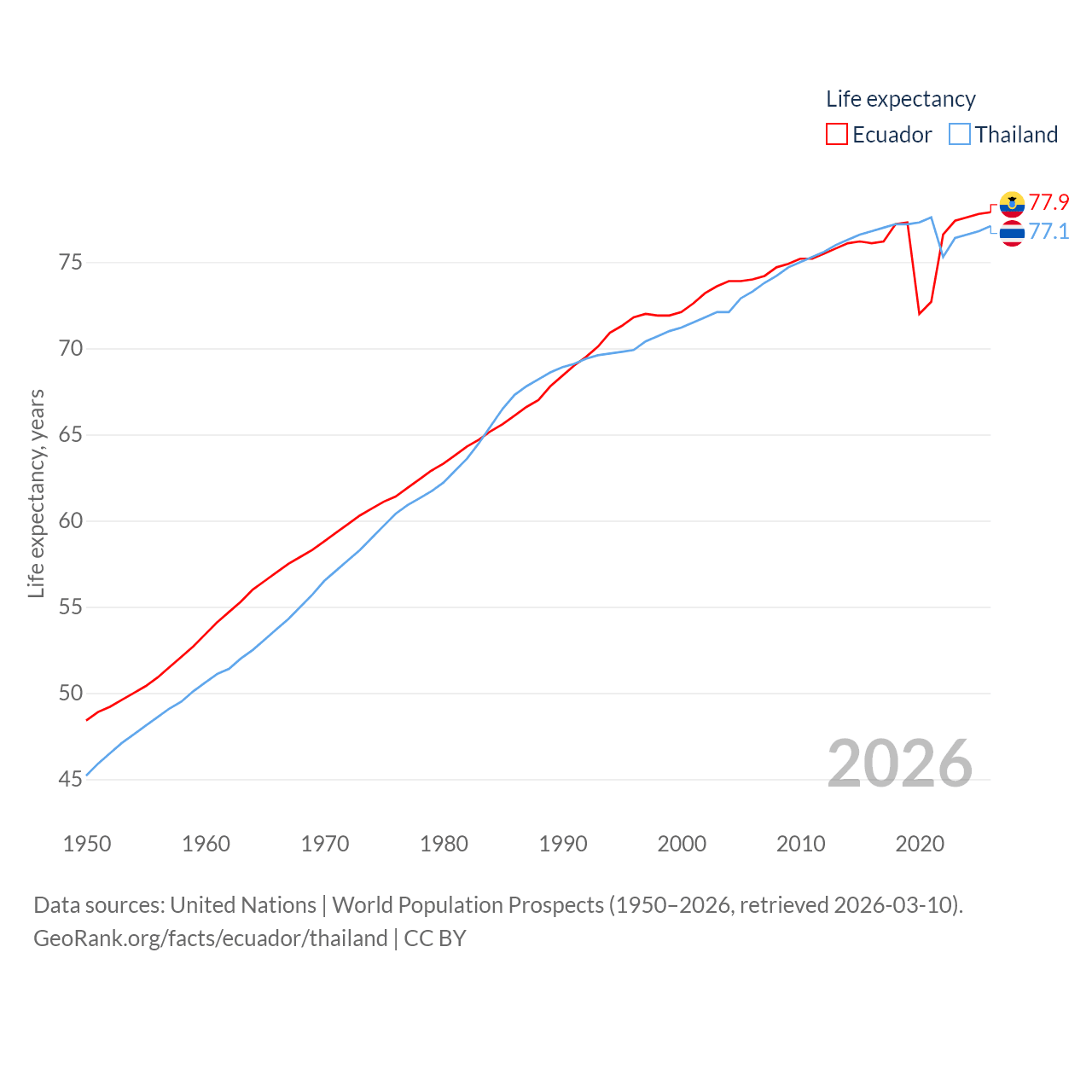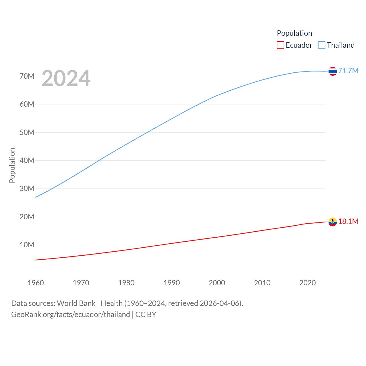 Ecuador has a population of 18.1M (ranked 71/197), compared with 71.7M in Thailand (ranked 20/197). Ecuador's land area is 95,892 sq mi versus 197,256 sq mi for Thailand (ranked 76th vs. 50th).