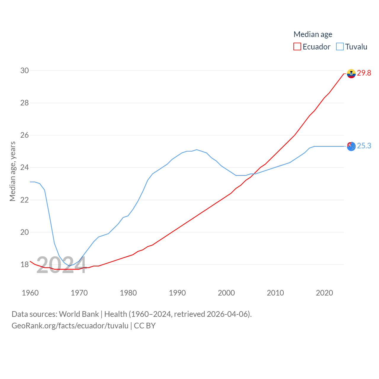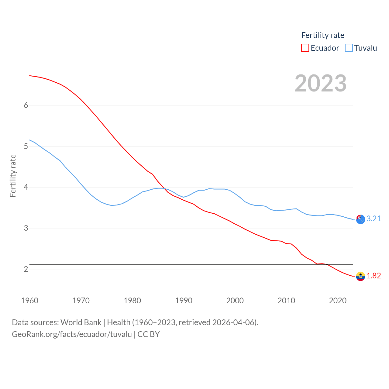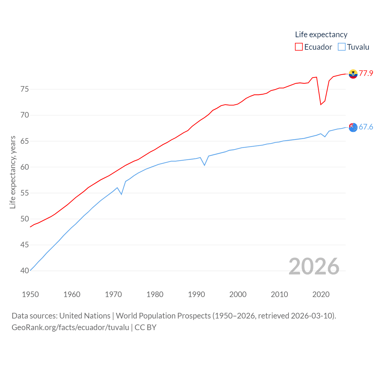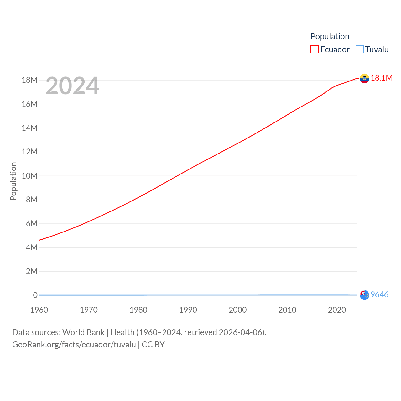 Ecuador has a population of 18.1M (ranked 71/197), compared with 9.65K in Tuvalu (ranked 196/197). Ecuador's land area is 95,892 sq mi versus 11.6 sq mi for Tuvalu (ranked 76th vs. 194th).