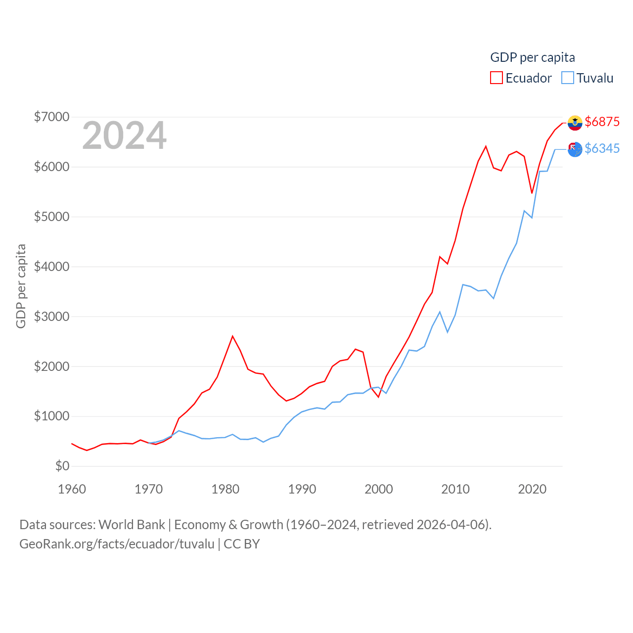 By GDP, Ecuador ranks 62/197 ($125B) and Tuvalu ranks 196/197 ($62.3M). By GDP per capita, Ecuador ranks 103/197 ($6,875), while Tuvalu ranks 110/197 ($6,345).