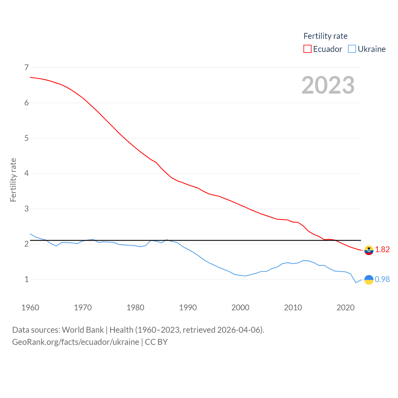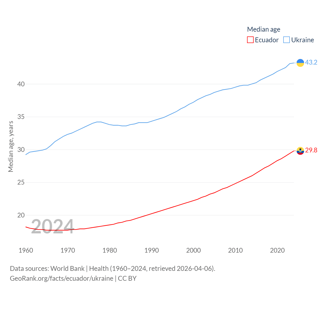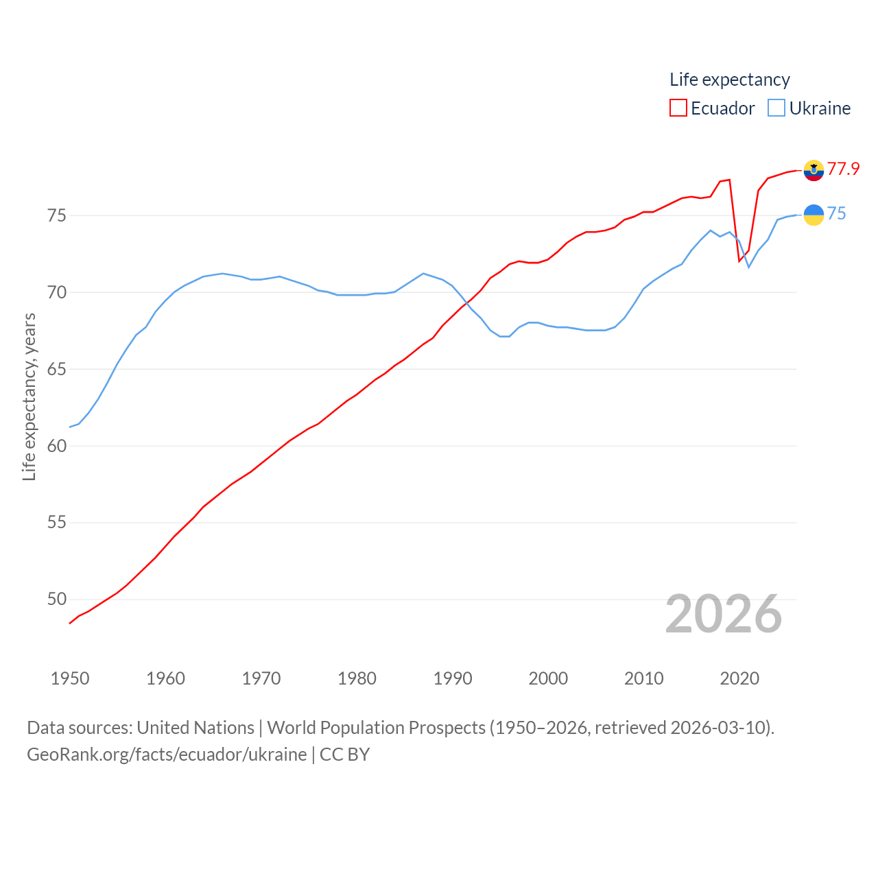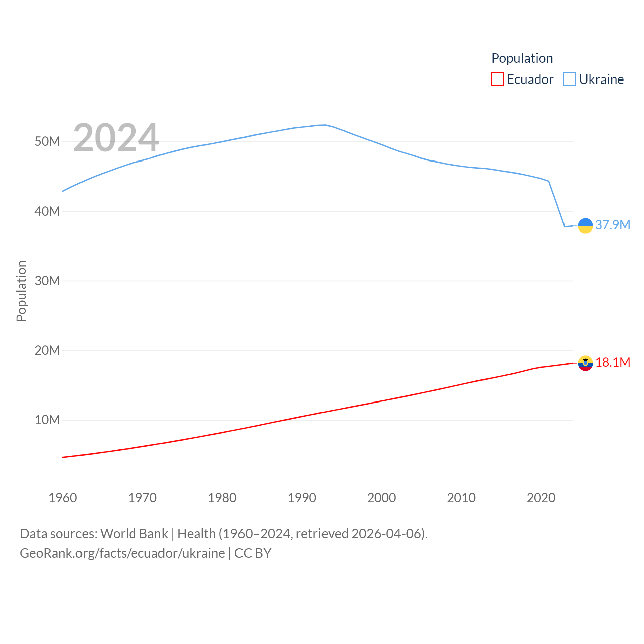 Ecuador has a population of 18.1M (ranked 71/197), compared with 37.9M in Ukraine (ranked 41/197). Ecuador's land area is 95,892 sq mi versus 223,708 sq mi for Ukraine (ranked 76th vs. 46th).