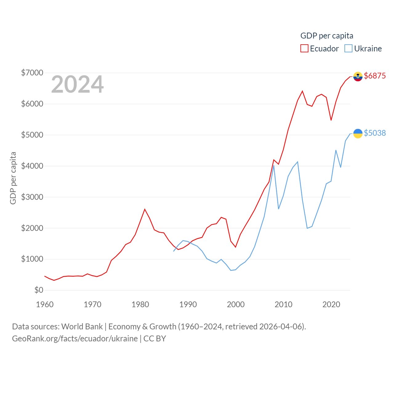 By GDP, Ecuador ranks 62/197 ($125B) and Ukraine ranks 57/197 ($191B). By GDP per capita, Ecuador ranks 103/197 ($6,875), while Ukraine ranks 120/197 ($5,038).