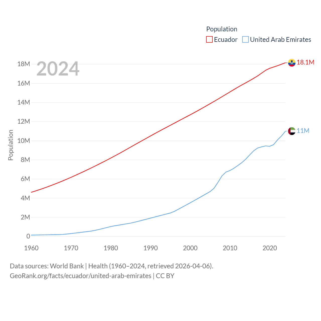 Ecuador has a population of 18.1M (ranked 71/197), compared with 11M in The United Arab Emirates (ranked 86/197). Ecuador's land area is 95,892 sq mi versus 27,421 sq mi for The United Arab Emirates (ranked 76th vs. 117th).