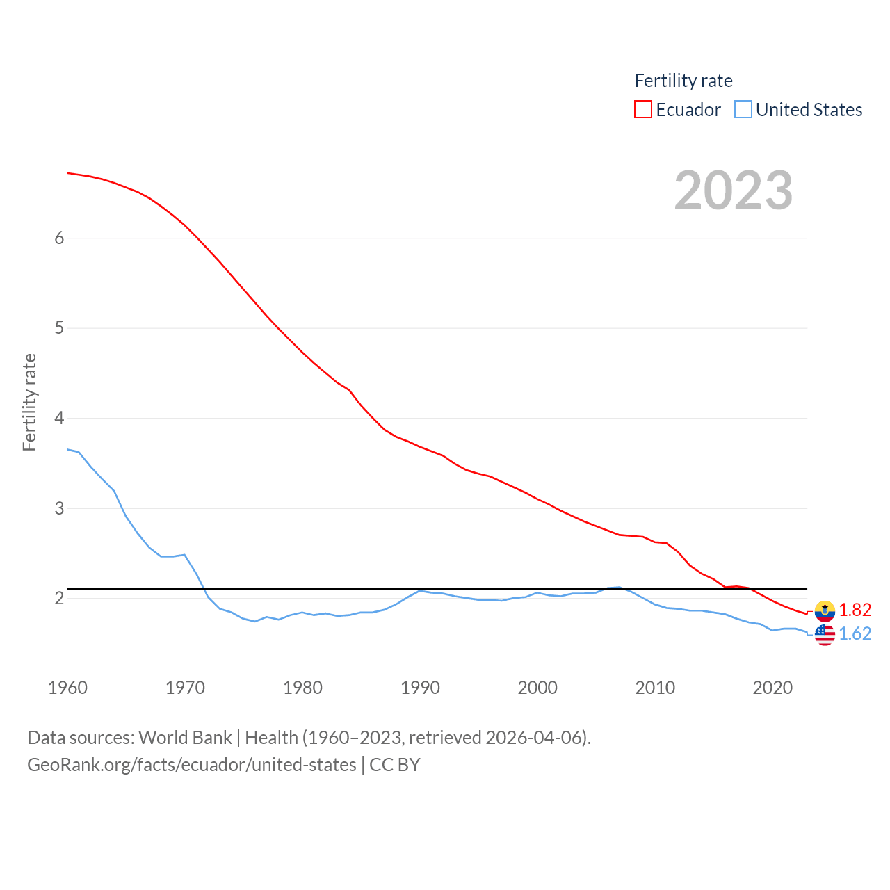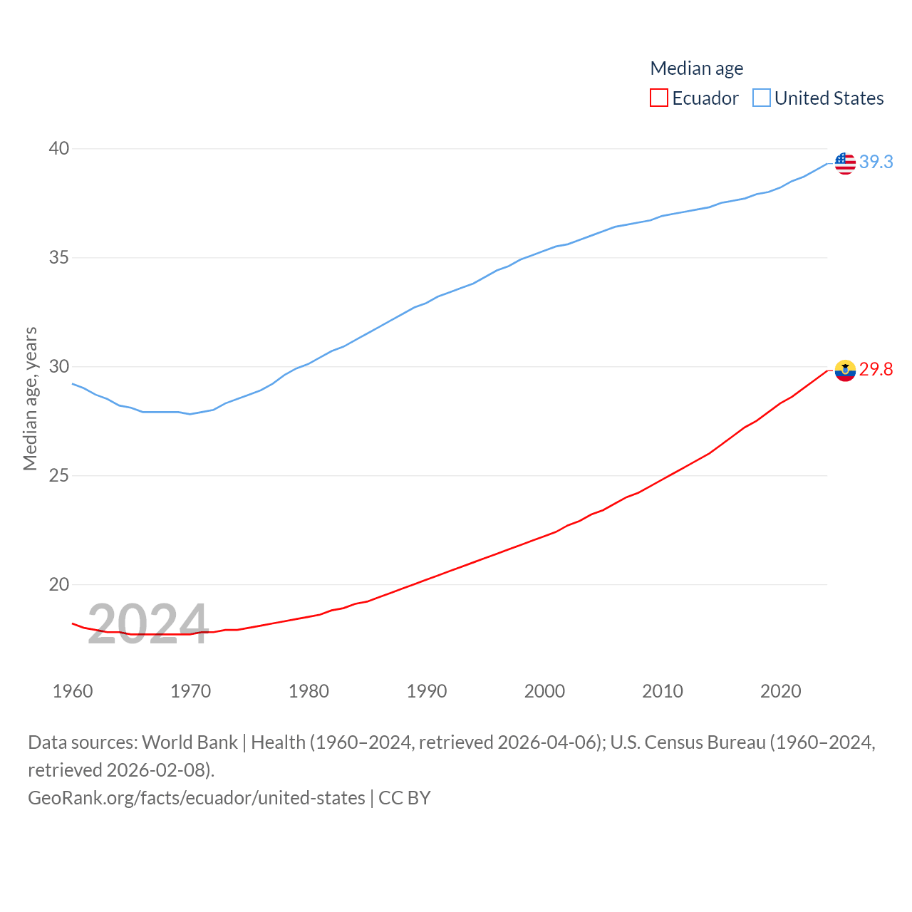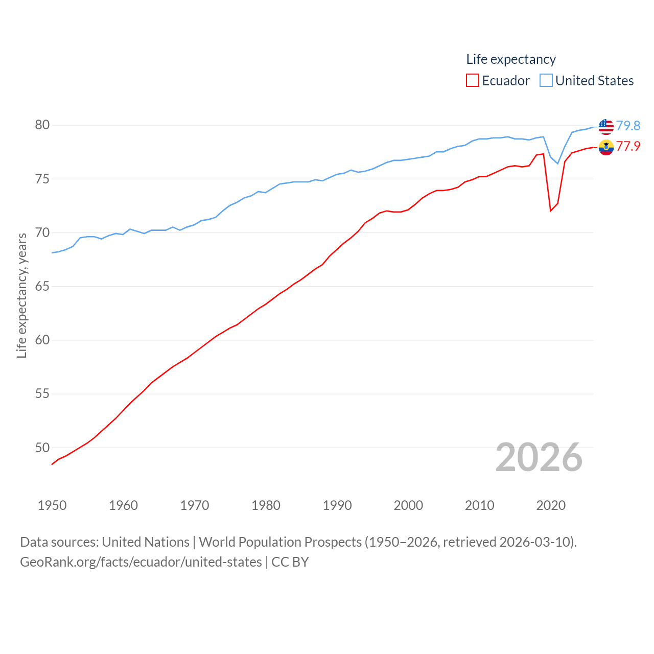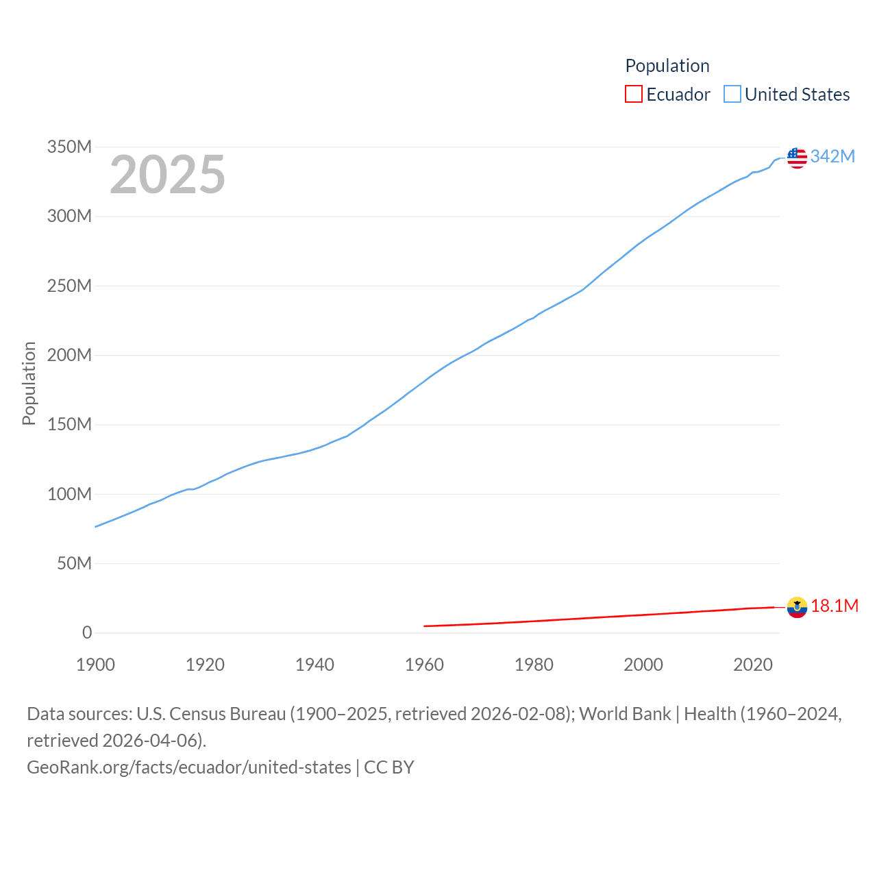 Ecuador has a population of 18.1M (ranked 71/197), compared with 342M in The United States (ranked 3/197). Ecuador's land area is 95,892 sq mi versus 3,531,839 sq mi for The United States (ranked 76th vs. 3rd).