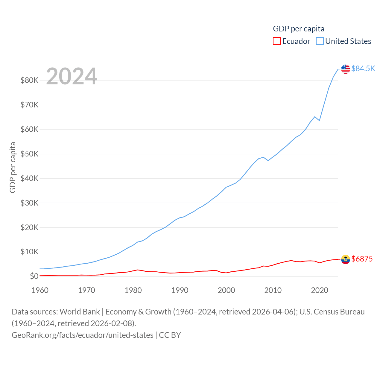 By GDP, Ecuador ranks 62/197 ($125B) and The United States ranks 1/197 ($28.8T). By GDP per capita, Ecuador ranks 103/197 ($6,875), while The United States ranks 10/197 ($84,534).