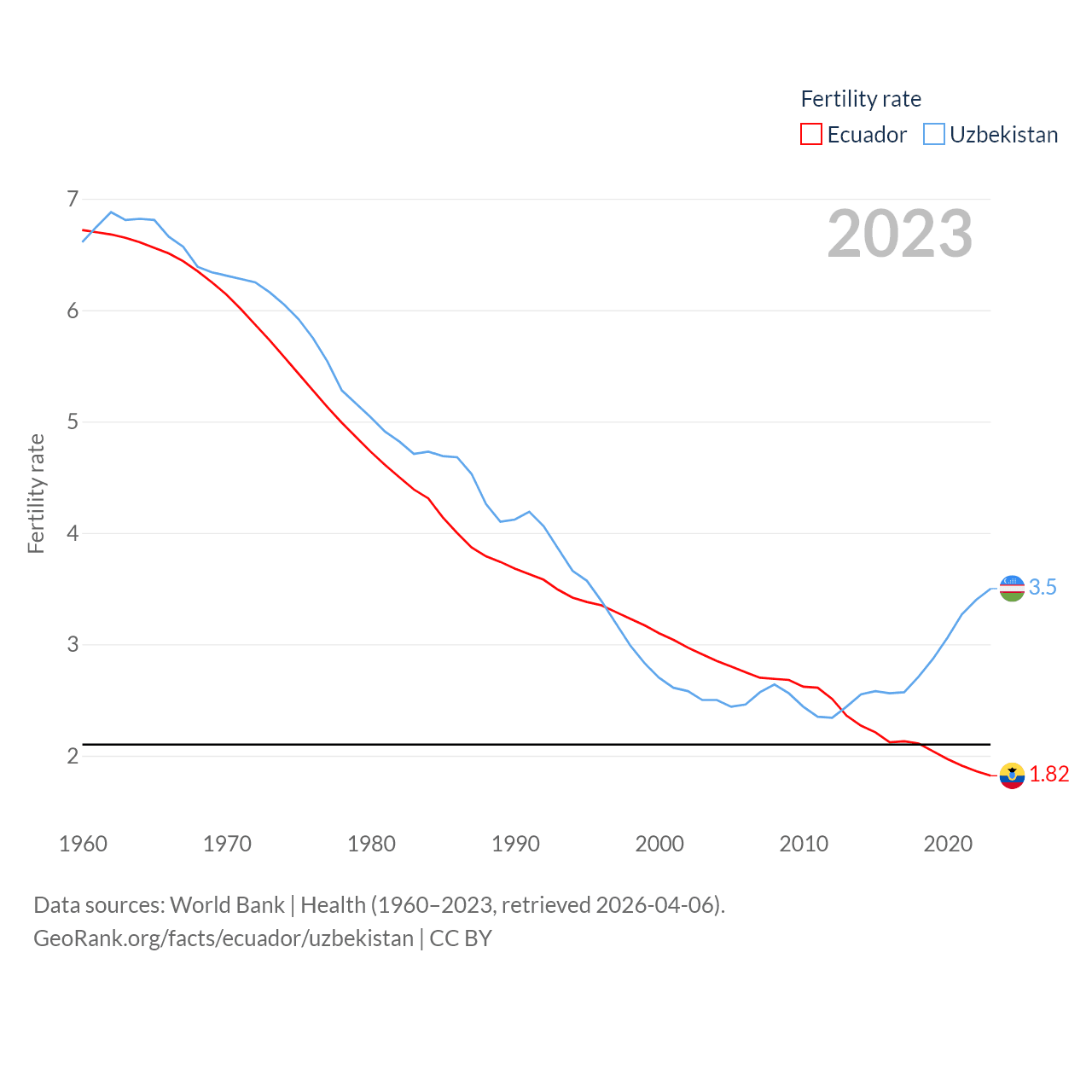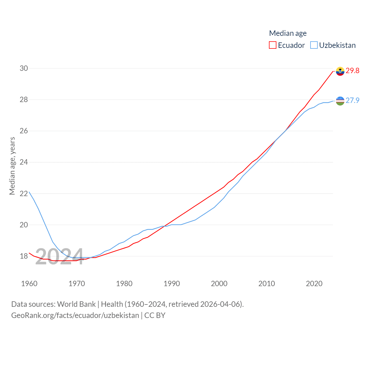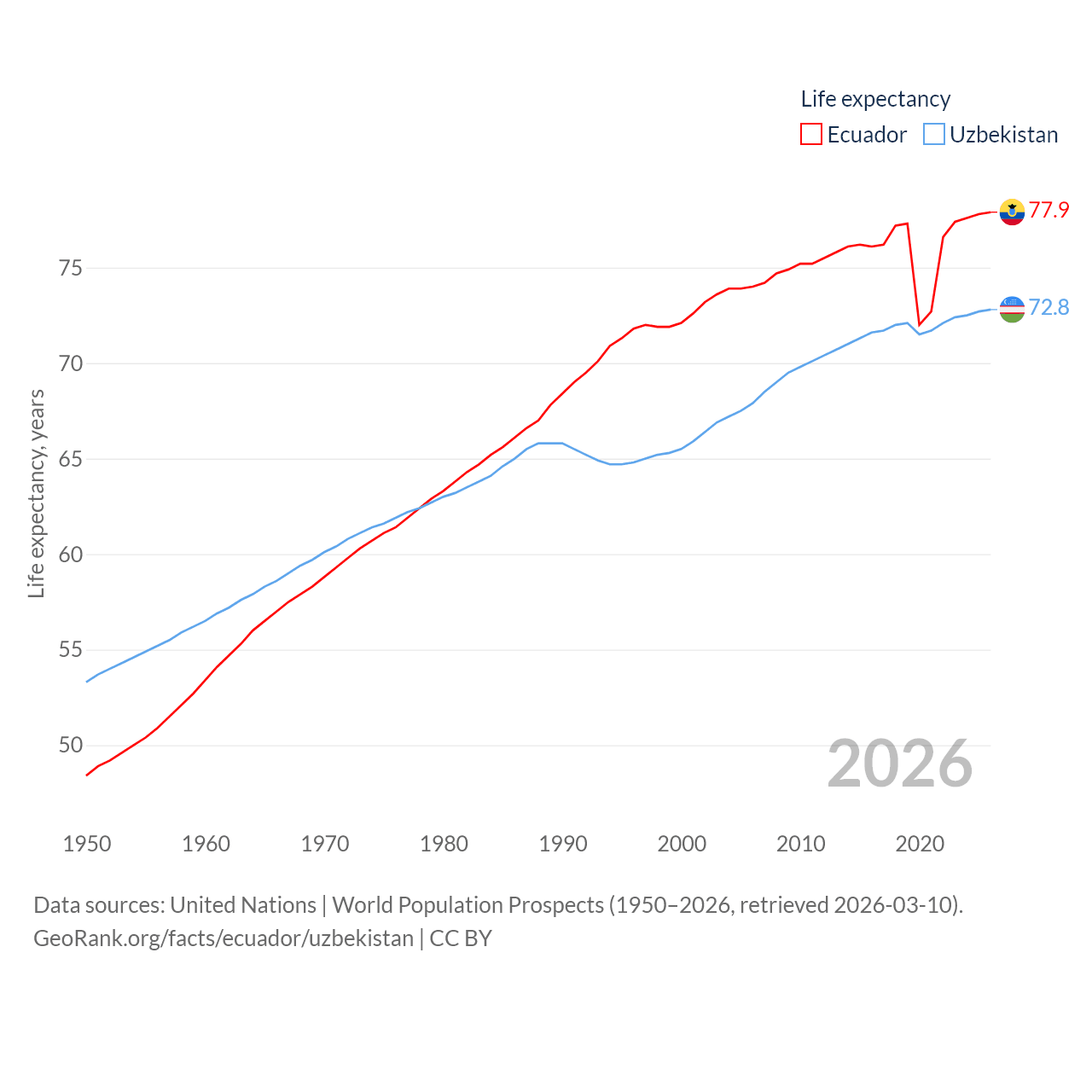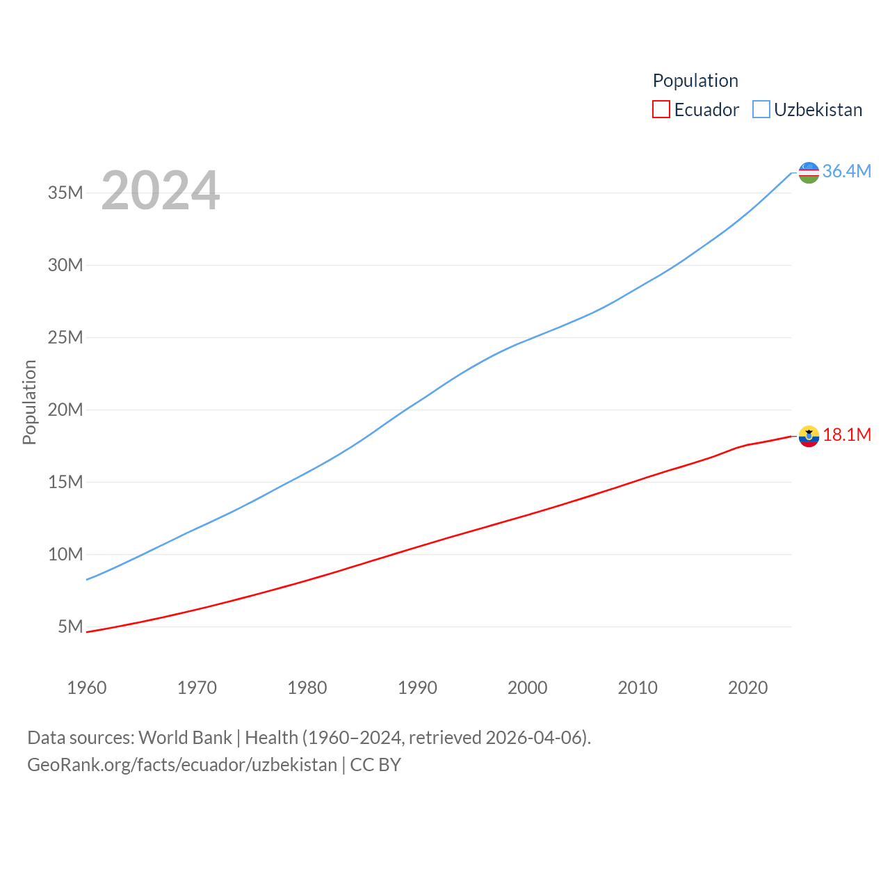 Ecuador has a population of 18.1M (ranked 71/197), compared with 36.4M in Uzbekistan (ranked 43/197). Ecuador's land area is 95,892 sq mi versus 170,136 sq mi for Uzbekistan (ranked 76th vs. 56th).