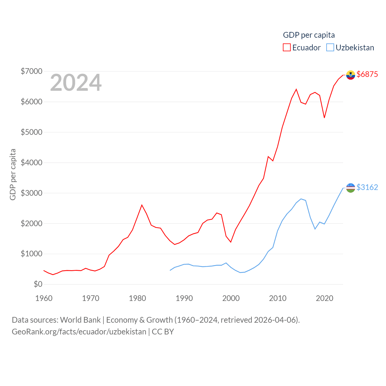 By GDP, Ecuador ranks 62/197 ($125B) and Uzbekistan ranks 66/197 ($115B). By GDP per capita, Ecuador ranks 103/197 ($6,875), while Uzbekistan ranks 139/197 ($3,162).