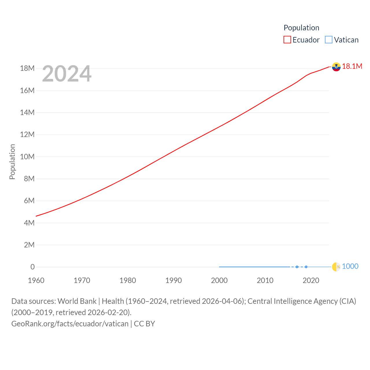 Ecuador has a population of 18.1M (ranked 71/197), compared with 1K in The Vatican (ranked 197/197). Ecuador's land area is 95,892 sq mi versus 0.17 sq mi for The Vatican (ranked 76th vs. 197th).