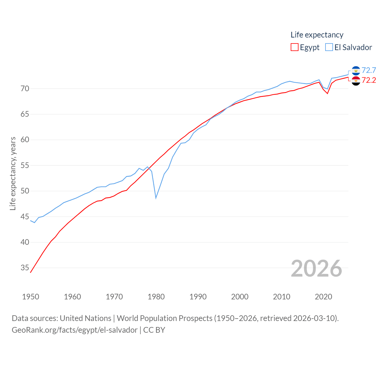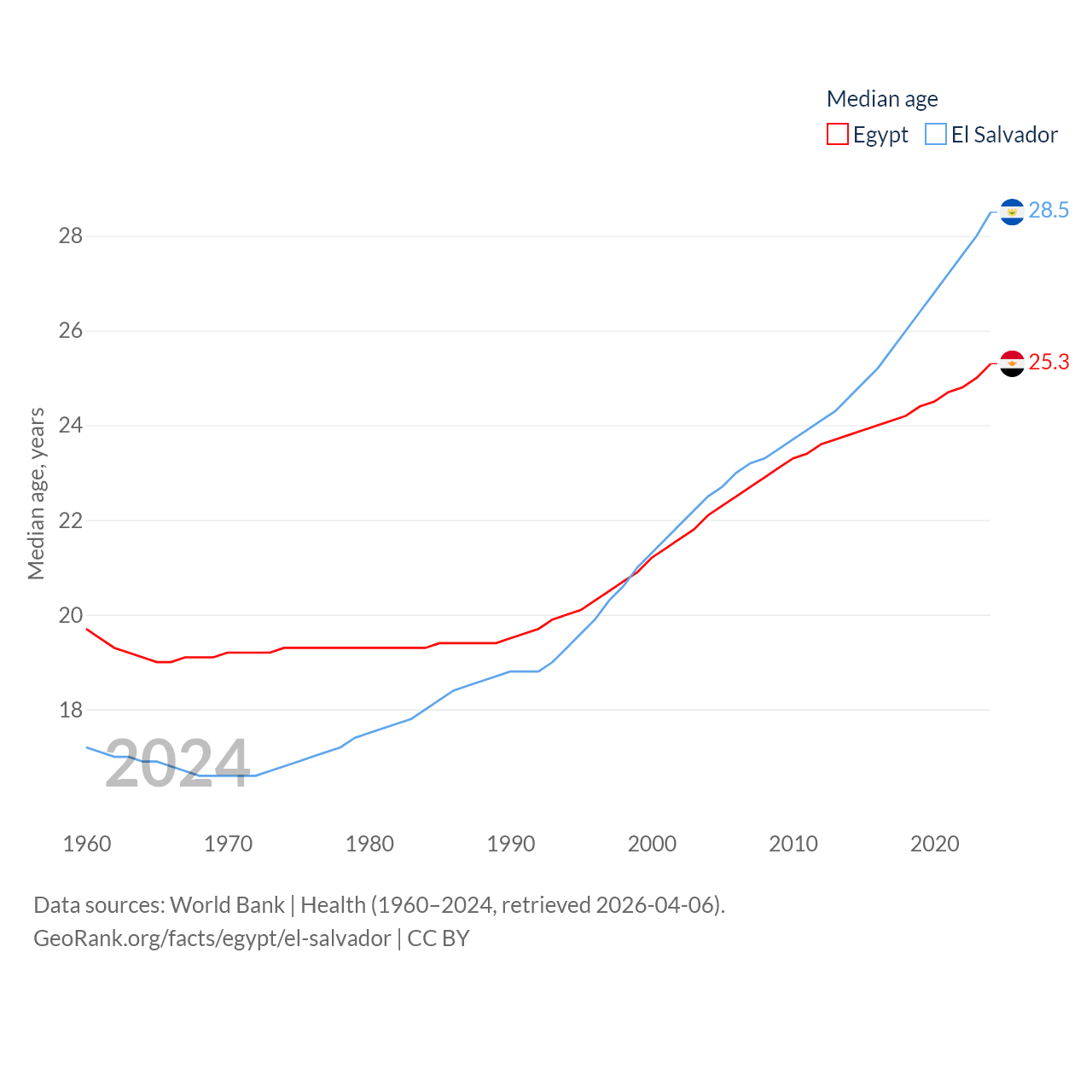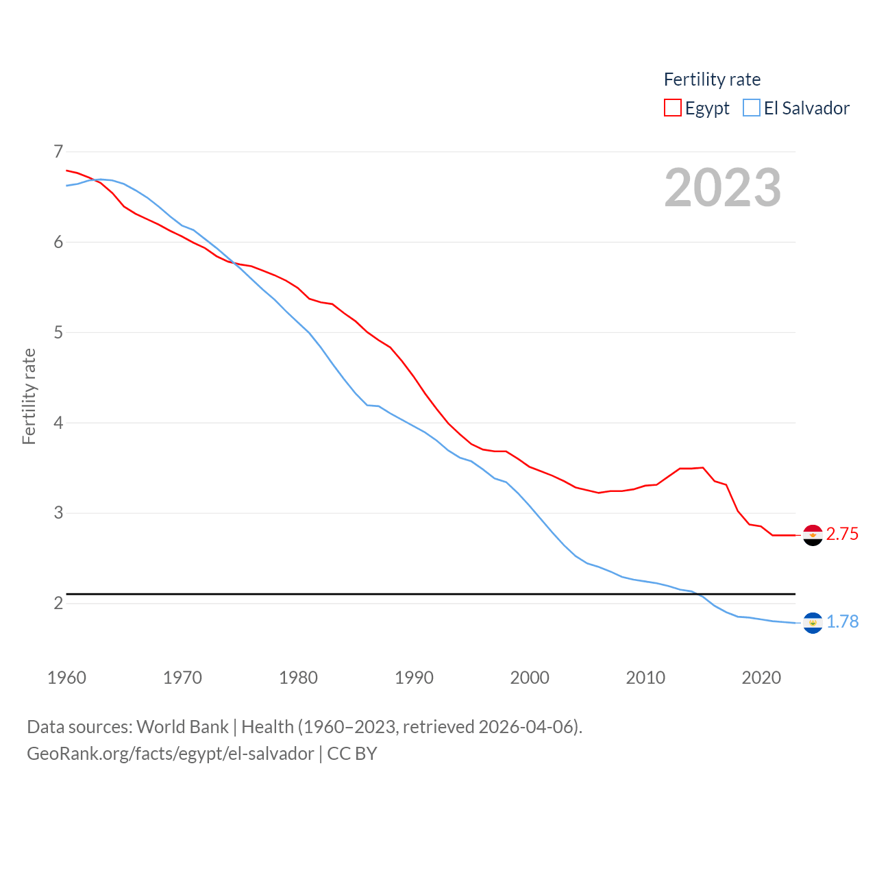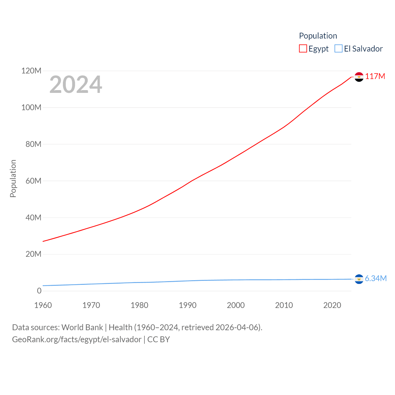 Egypt has a population of 117M (ranked 13/197), compared with 6.34M in El Salvador (ranked 111/197). Egypt's land area is 384,345 sq mi versus 8,000 sq mi for El Salvador (ranked 29th vs. 150th).