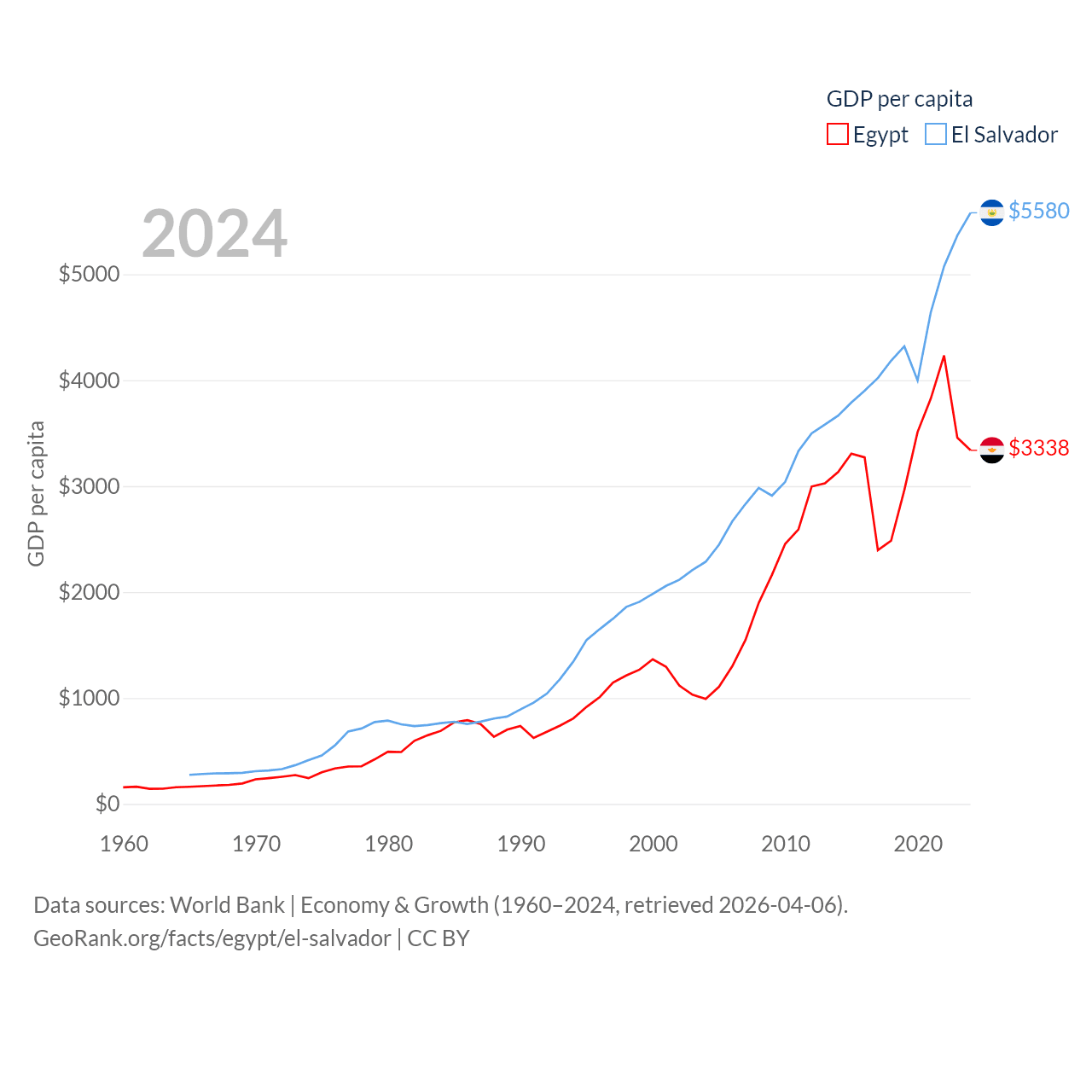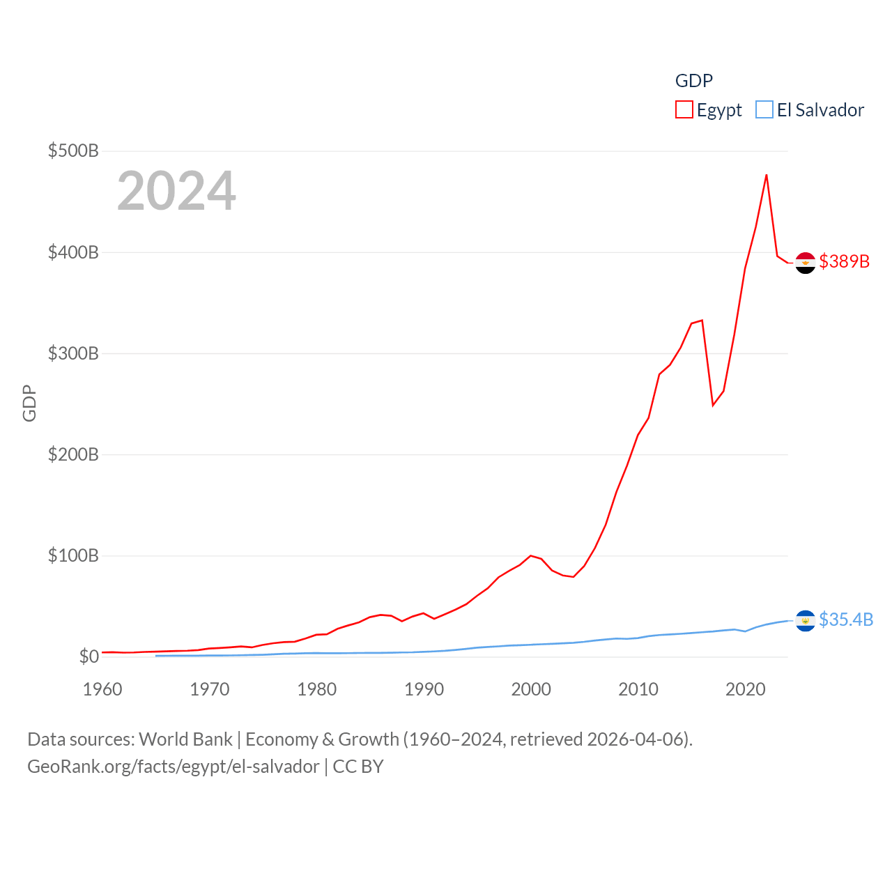 By GDP, Egypt ranks 41/197 ($389B) and El Salvador ranks 105/197 ($35.4B). By GDP per capita, Egypt ranks 138/197 ($3,338), while El Salvador ranks 116/197 ($5,580).