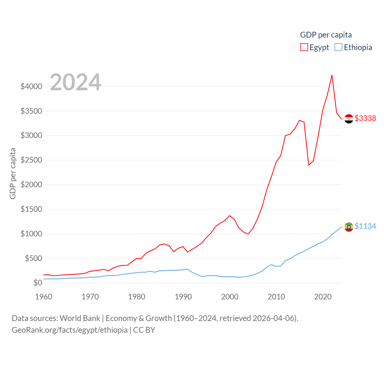By GDP, Egypt ranks 41/197 ($389B) and Ethiopia ranks 60/197 ($150B). By GDP per capita, Egypt ranks 138/197 ($3,338), while Ethiopia ranks 171/197 ($1,134).