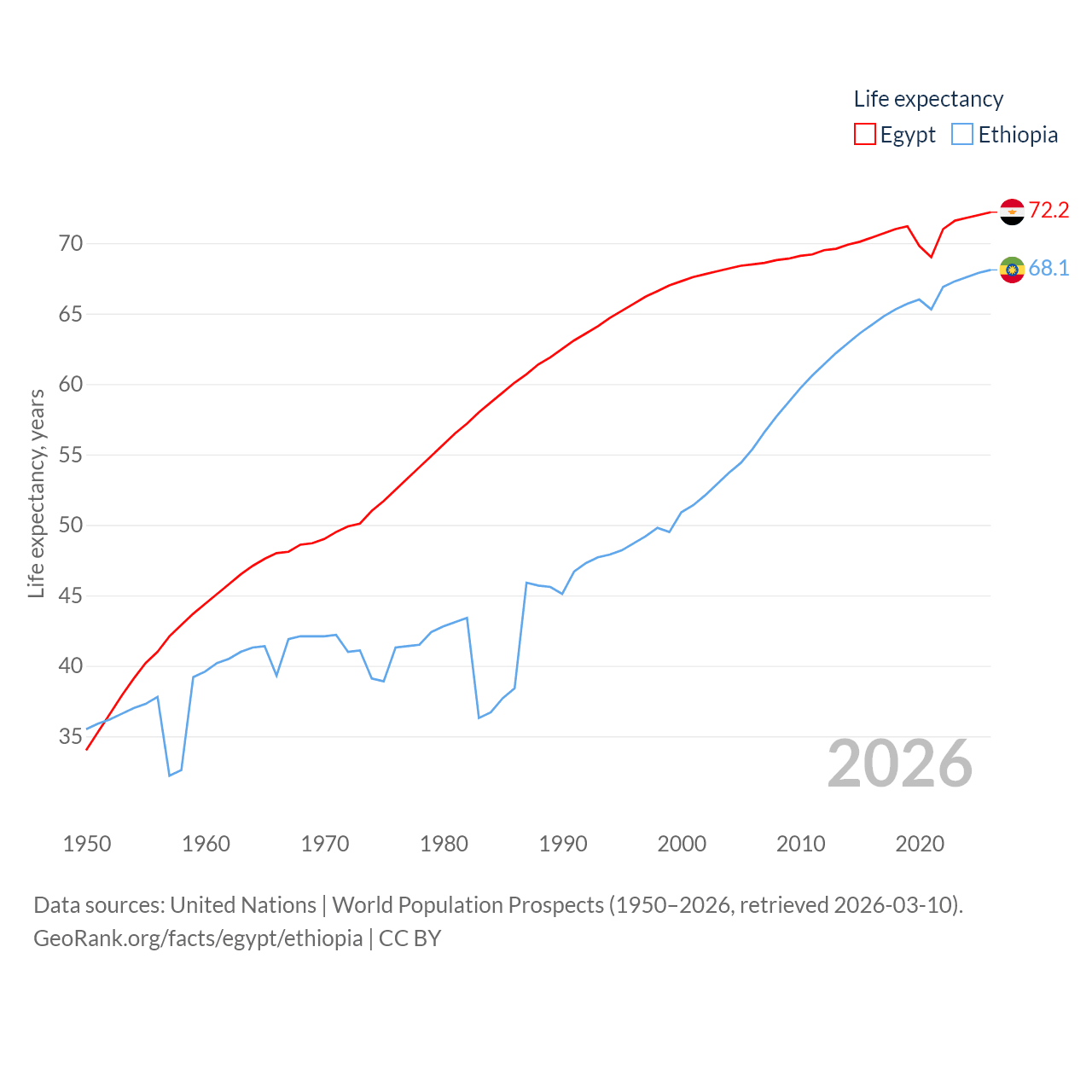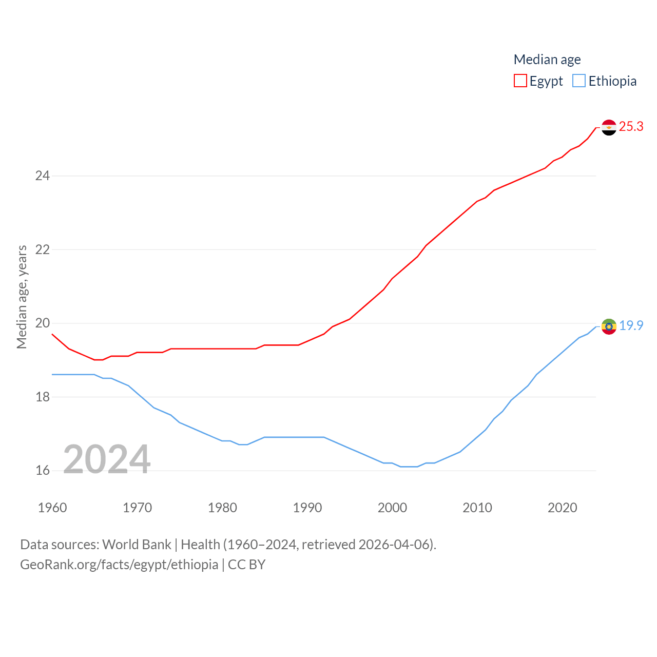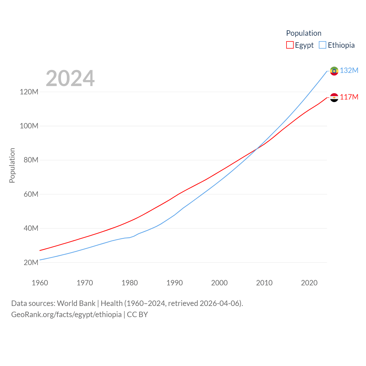 Egypt has a population of 117M (ranked 13/197), compared with 132M in Ethiopia (ranked 10/197). Egypt's land area is 384,345 sq mi versus 435,716 sq mi for Ethiopia (ranked 29th vs. 25th).