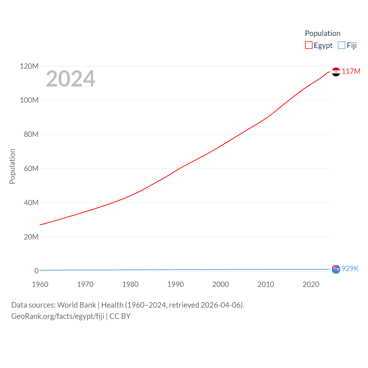 Egypt has a population of 117M (ranked 13/197), compared with 929K in Fiji (ranked 159/197). Egypt's land area is 384,345 sq mi versus 7,054 sq mi for Fiji (ranked 29th vs. 152nd).