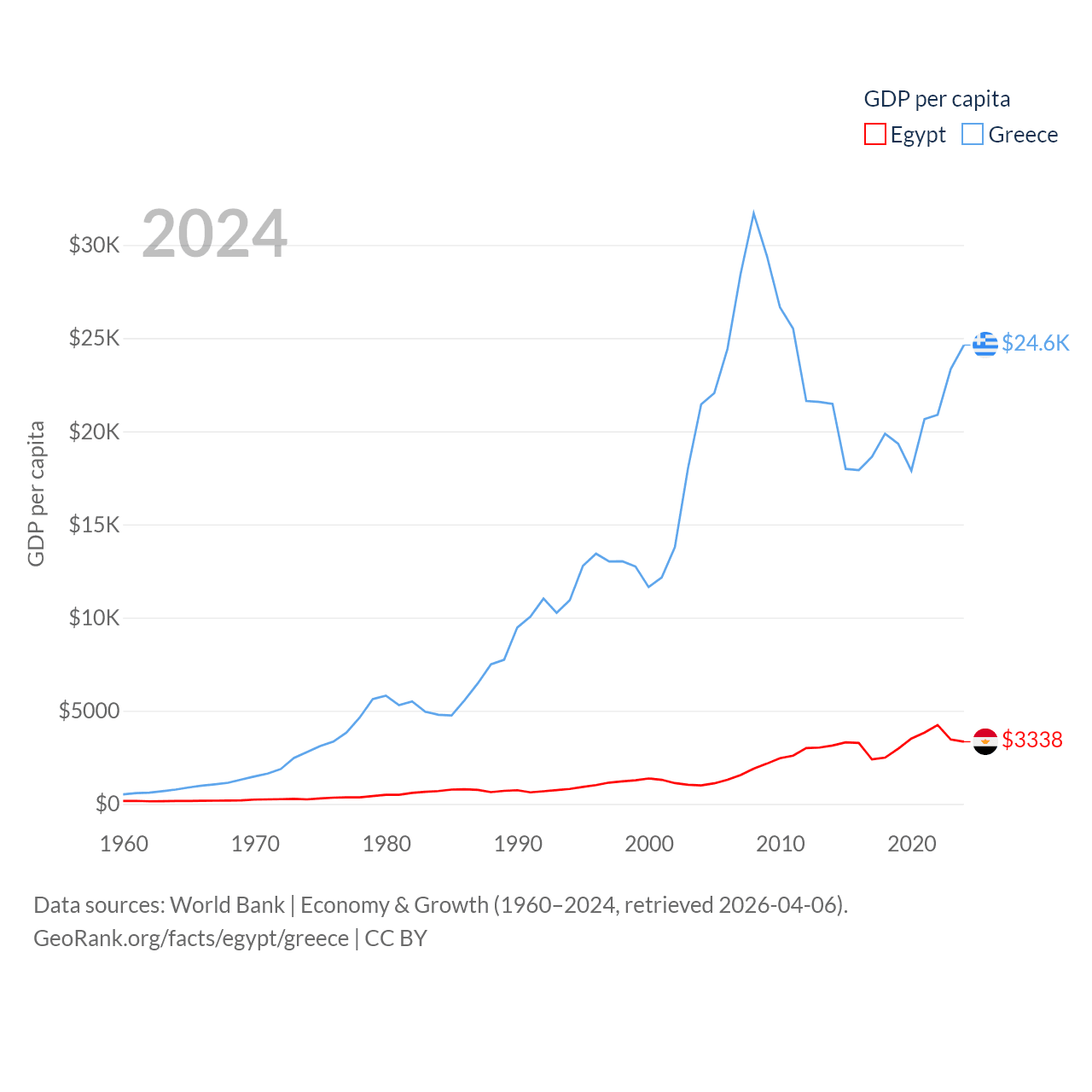 By GDP, Egypt ranks 41/197 ($389B) and Greece ranks 53/197 ($256B). By GDP per capita, Egypt ranks 138/197 ($3,338), while Greece ranks 49/197 ($24,626).