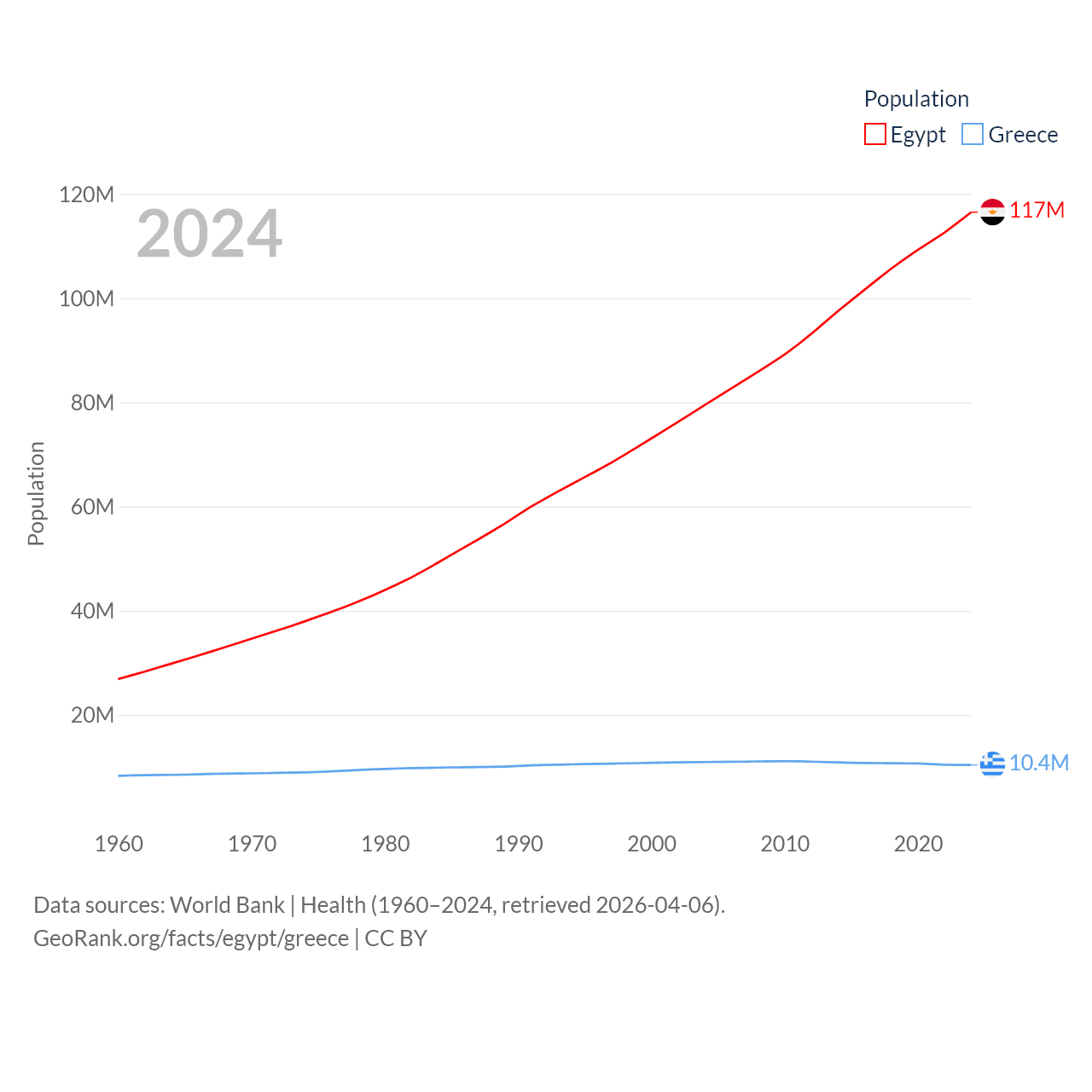 Egypt has a population of 117M (ranked 13/197), compared with 10.4M in Greece (ranked 94/197). Egypt's land area is 384,345 sq mi versus 49,769 sq mi for Greece (ranked 29th vs. 95th).