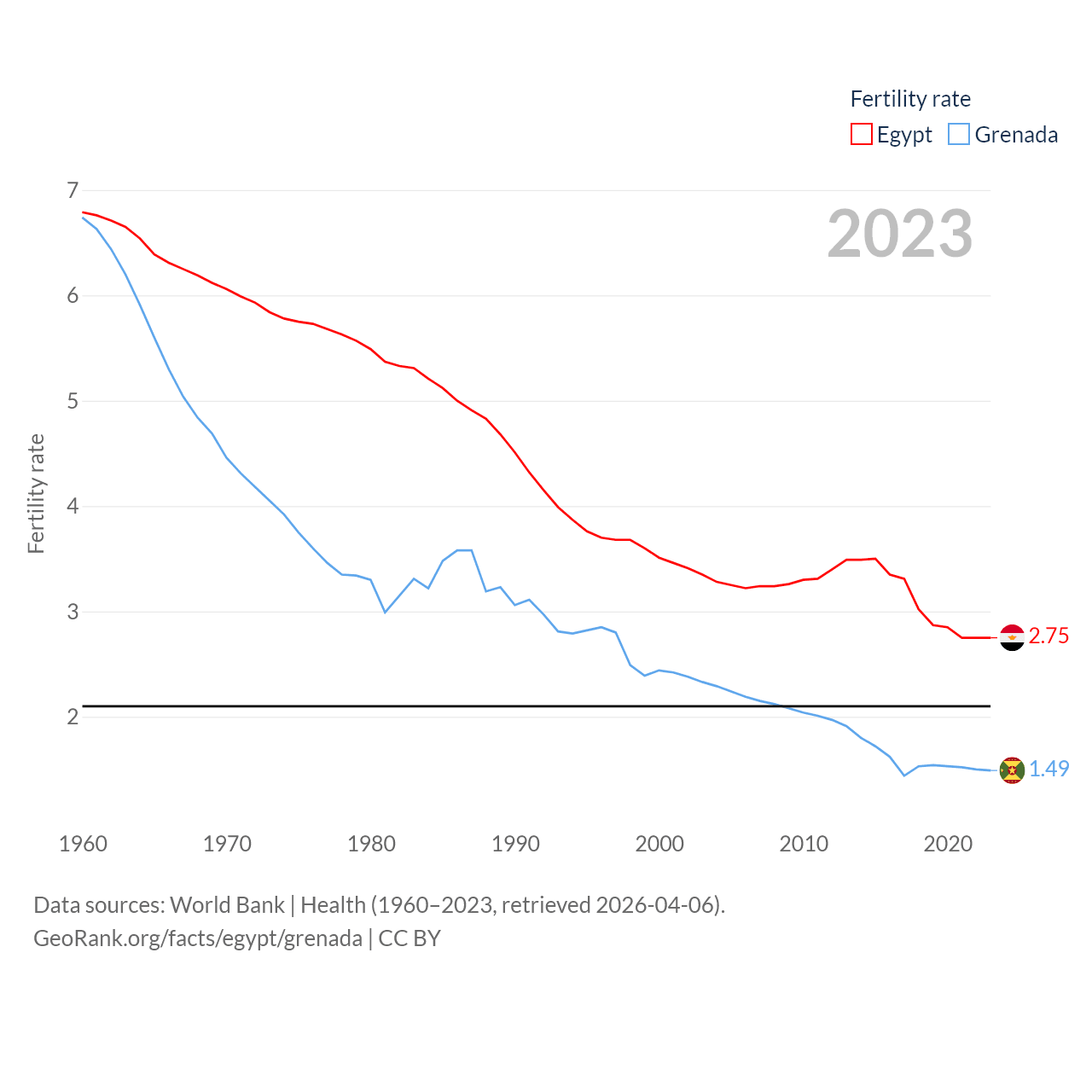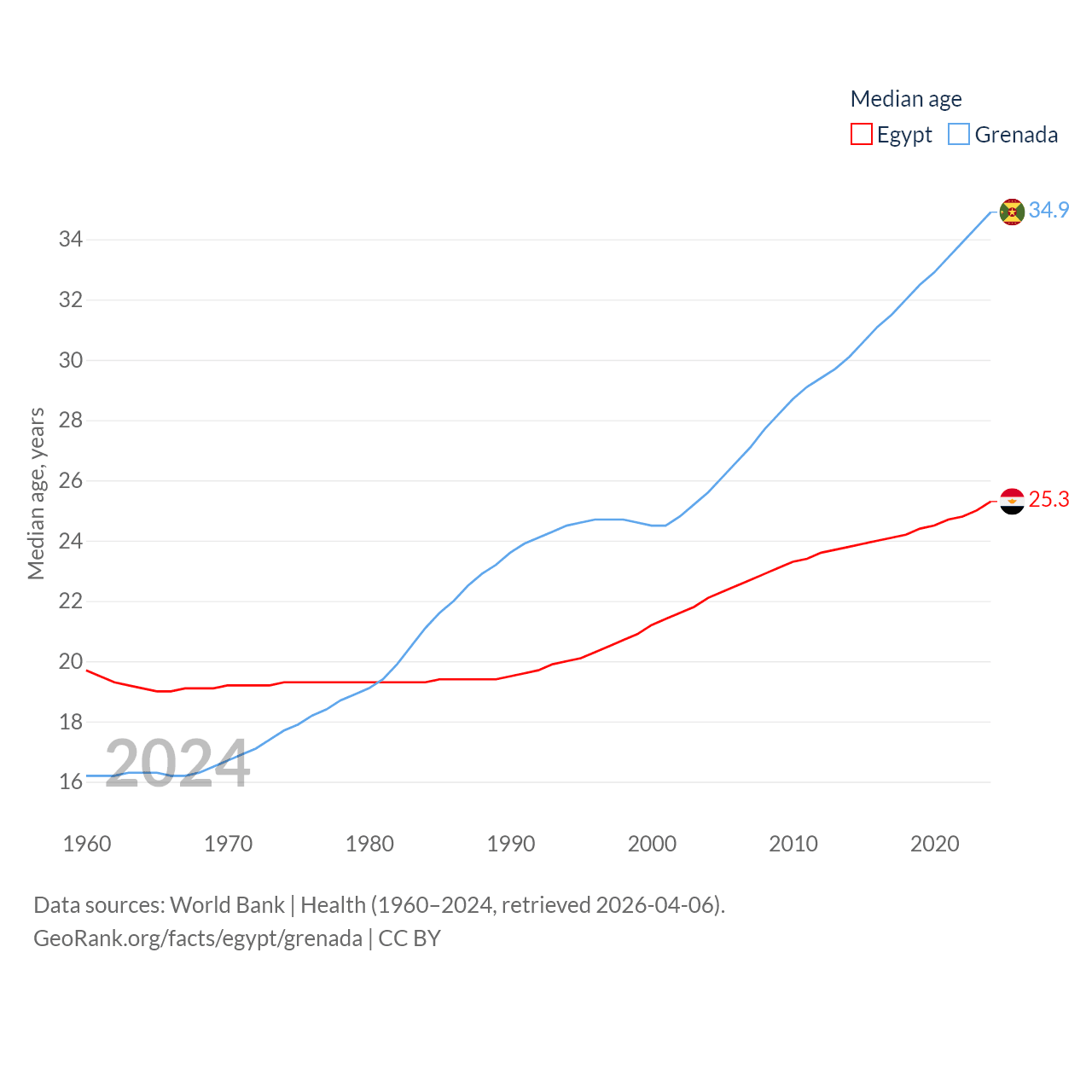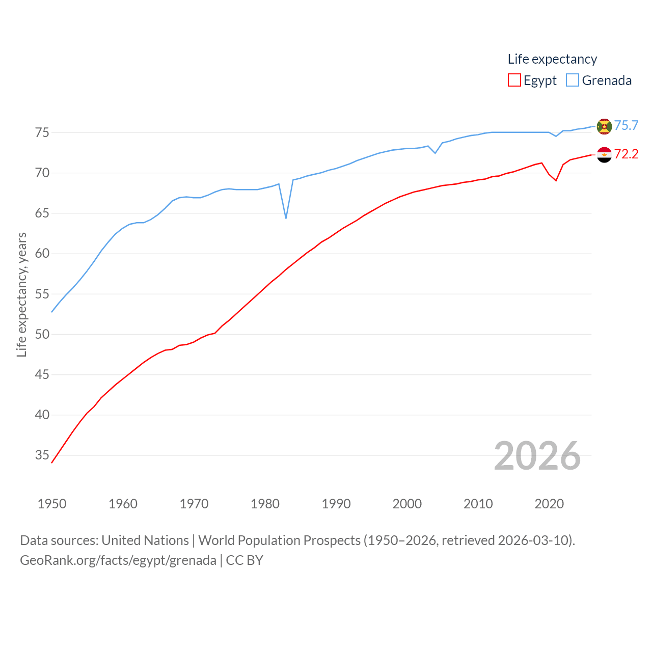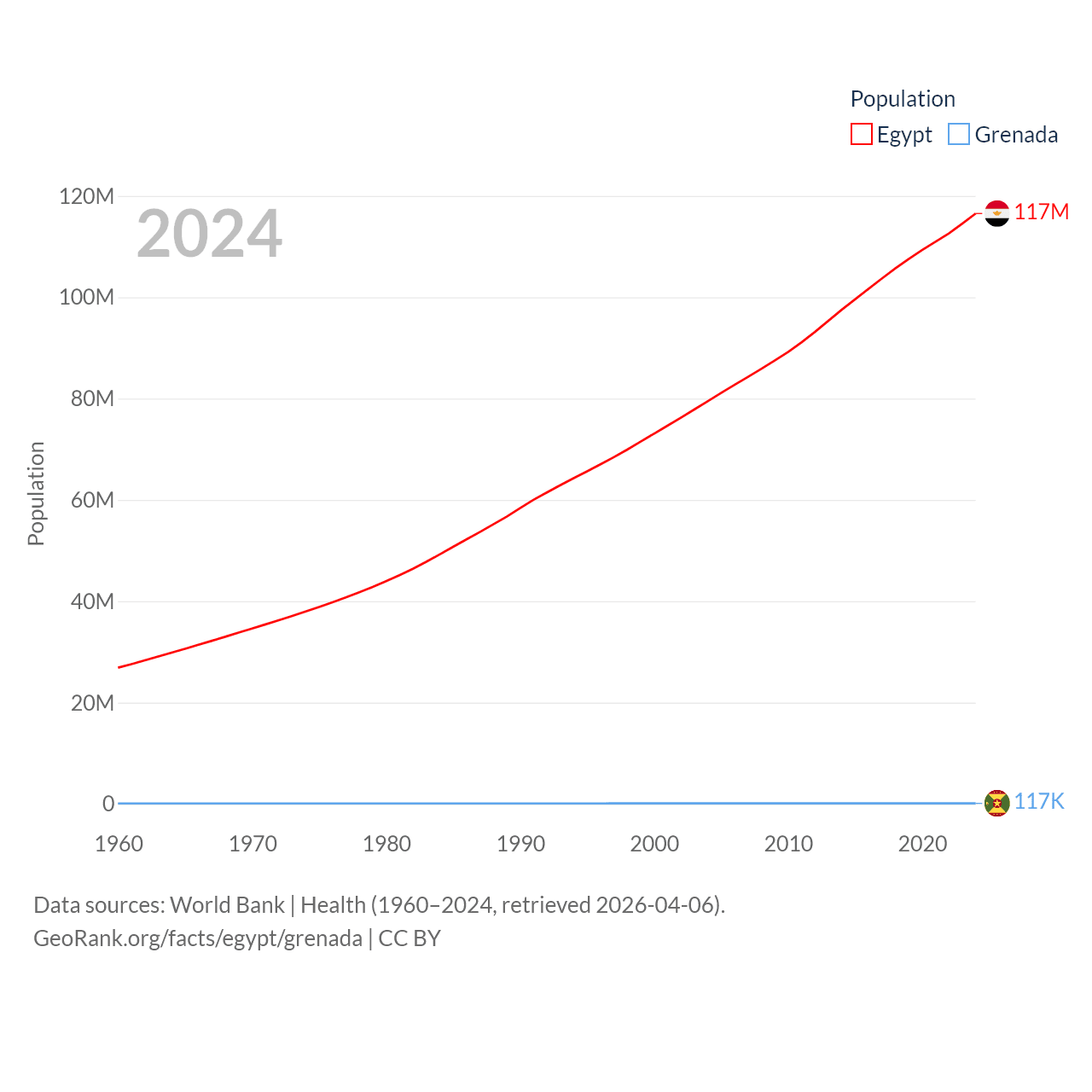 Egypt has a population of 117M (ranked 13/197), compared with 117K in Grenada (ranked 182/197). Egypt's land area is 384,345 sq mi versus 131.3 sq mi for Grenada (ranked 29th vs. 186th).