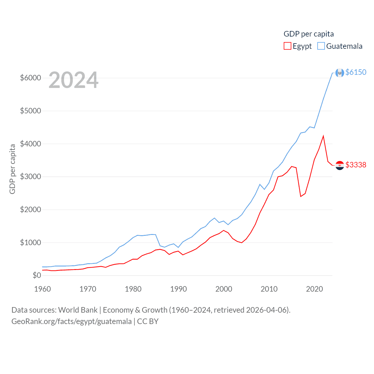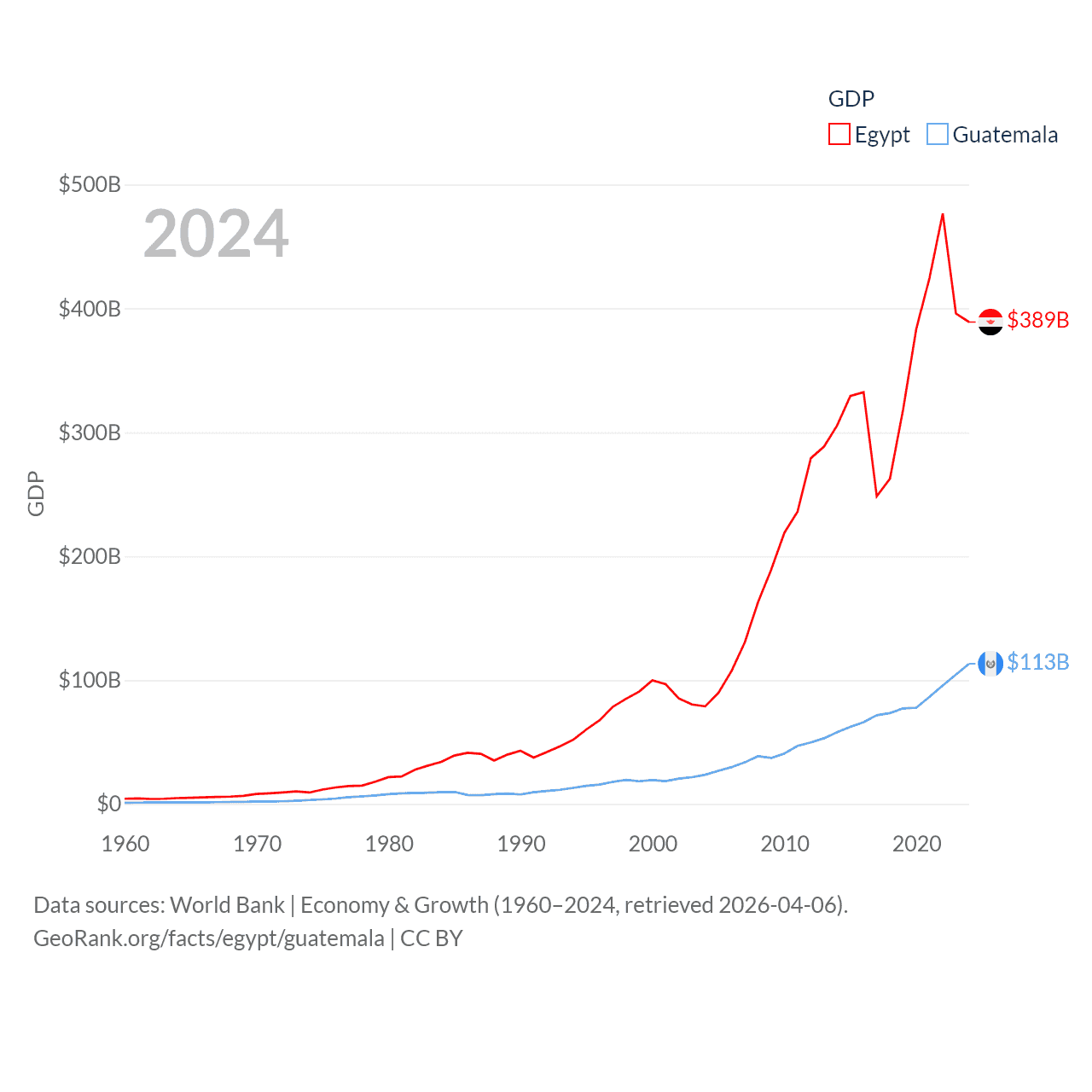 By GDP, Egypt ranks 41/197 ($389B) and Guatemala ranks 68/197 ($113B). By GDP per capita, Egypt ranks 138/197 ($3,338), while Guatemala ranks 112/197 ($6,150).