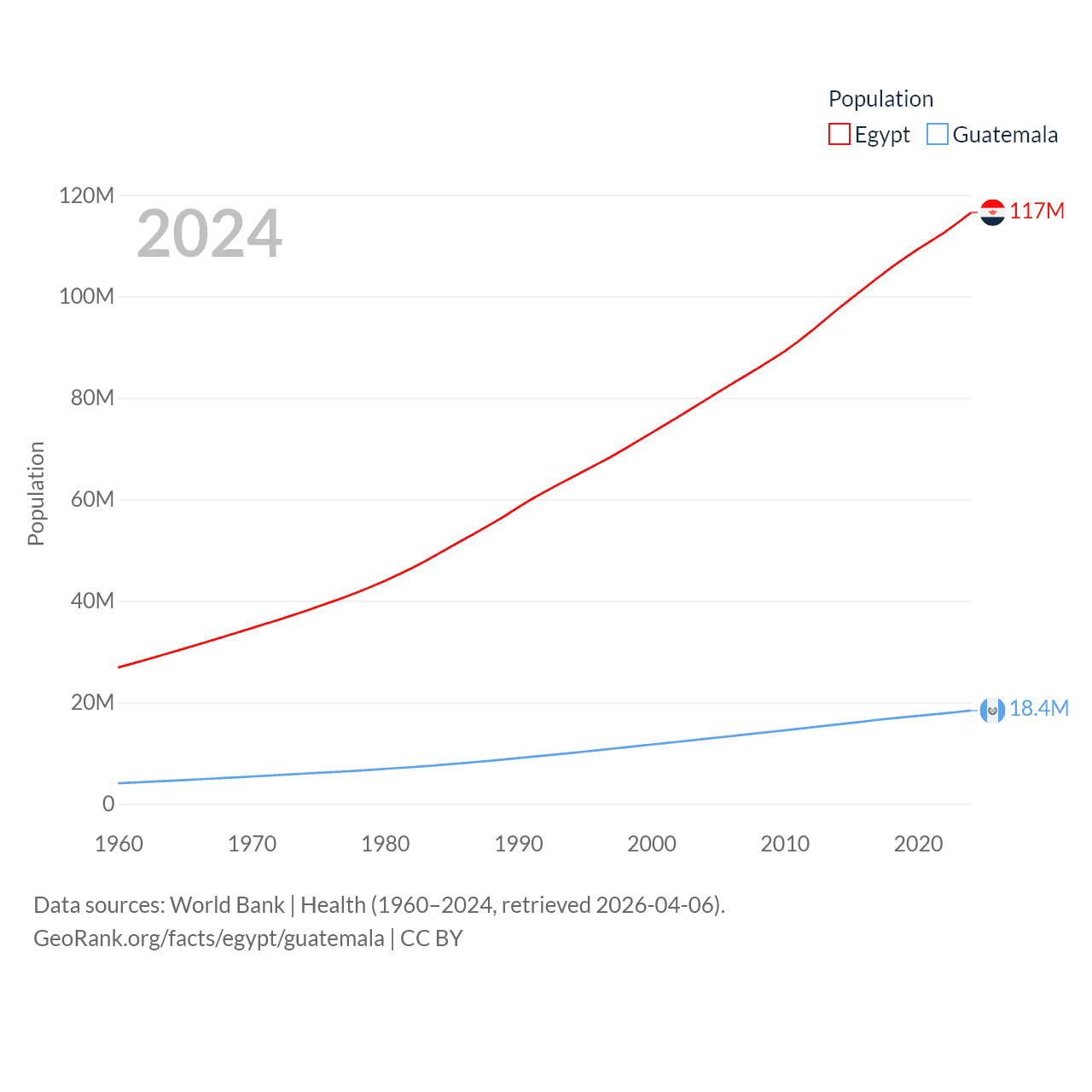 Egypt has a population of 117M (ranked 13/197), compared with 18.4M in Guatemala (ranked 70/197). Egypt's land area is 384,345 sq mi versus 41,375 sq mi for Guatemala (ranked 29th vs. 102nd).