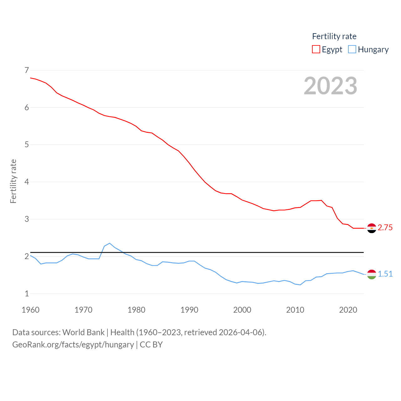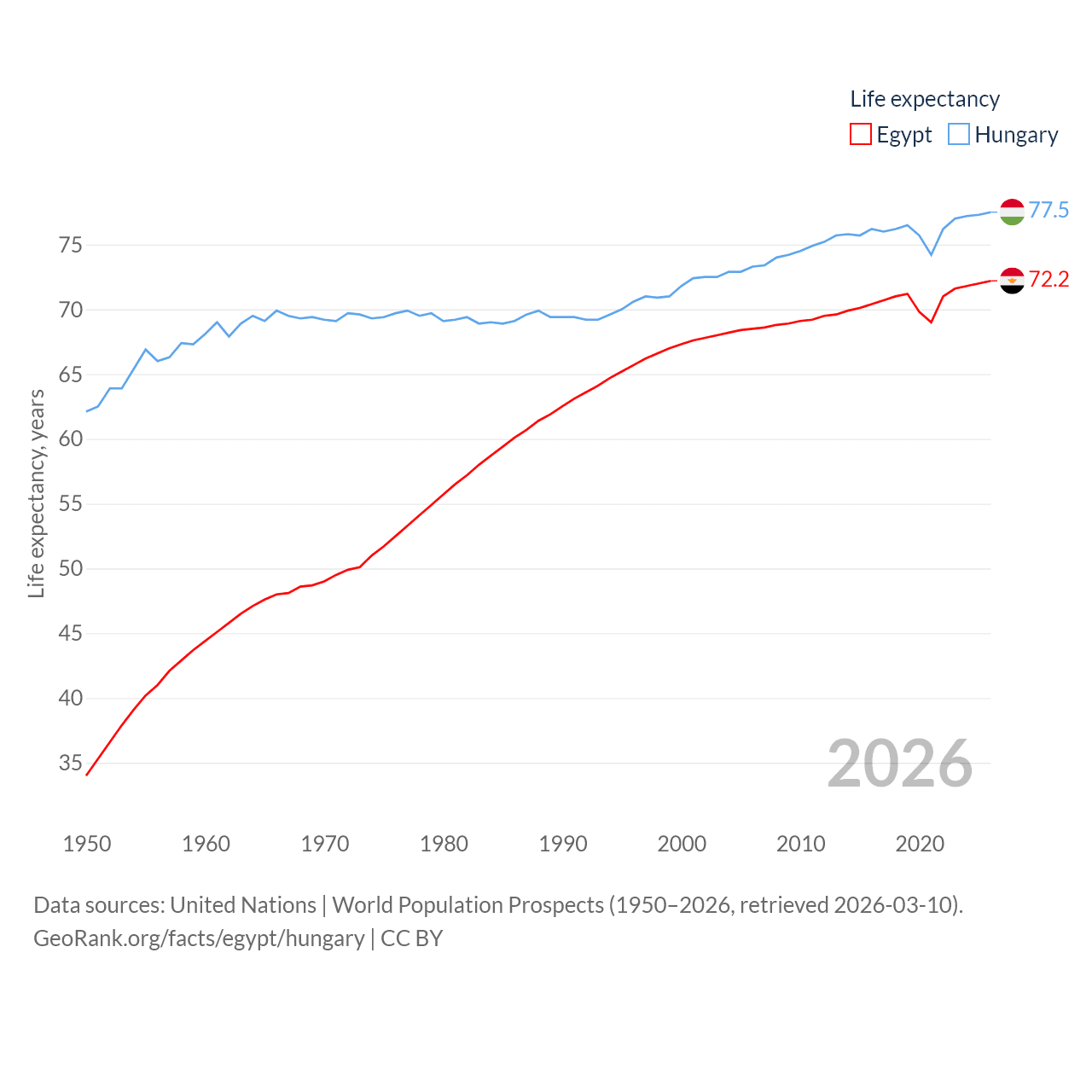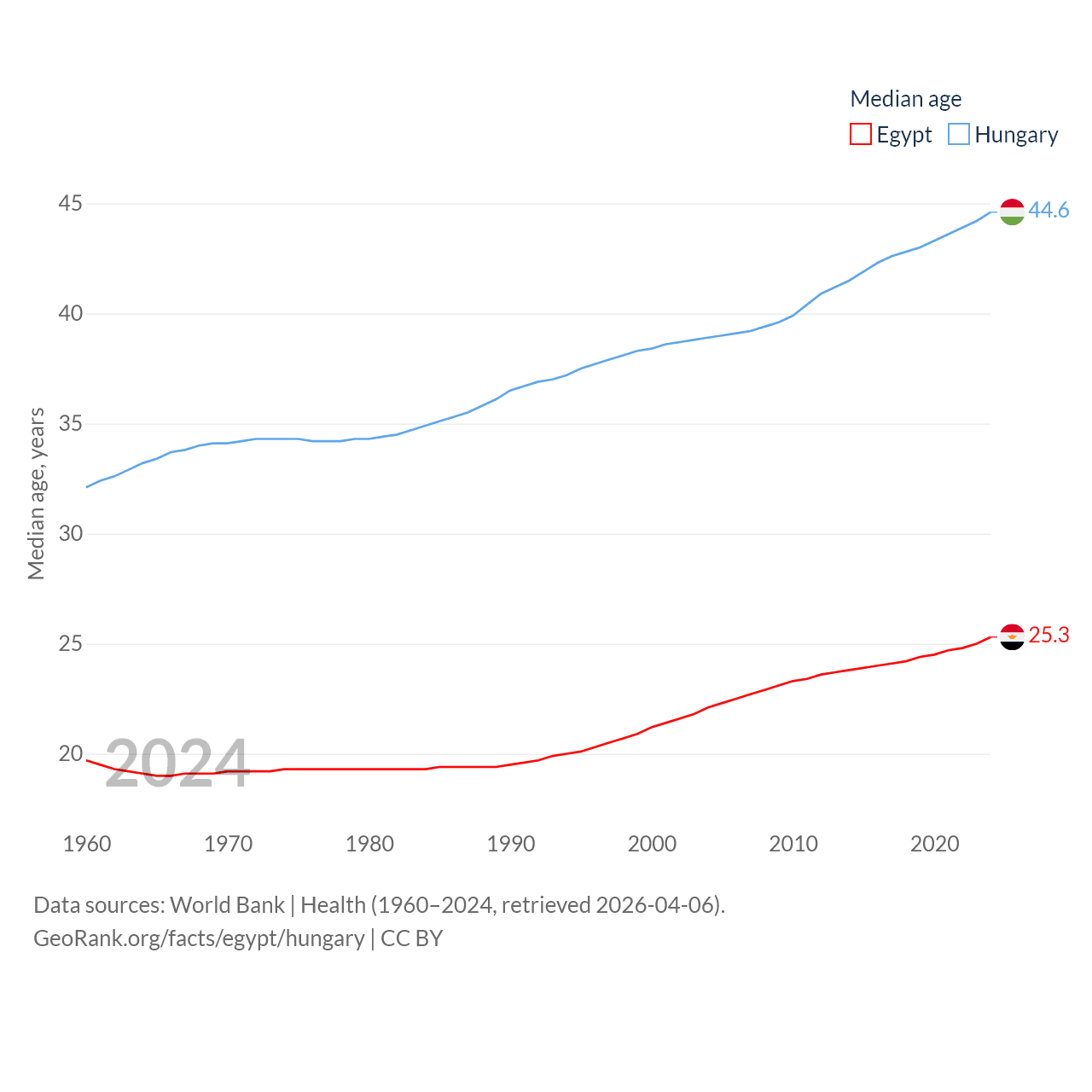 Egypt has a population of 117M (ranked 13/197), compared with 9.56M in Hungary (ranked 97/197). Egypt's land area is 384,345 sq mi versus 35,236 sq mi for Hungary (ranked 29th vs. 109th).