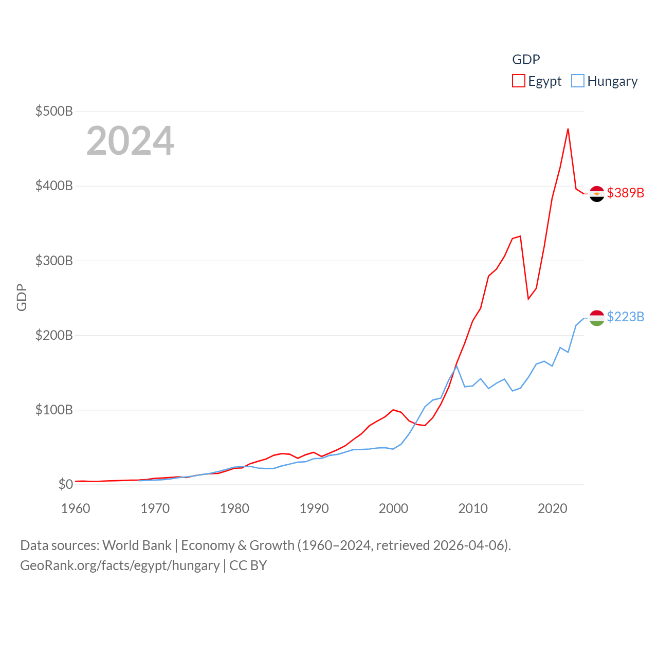 By GDP, Egypt ranks 41/197 ($389B) and Hungary ranks 55/197 ($223B). By GDP per capita, Egypt ranks 138/197 ($3,338), while Hungary ranks 55/197 ($23,292).