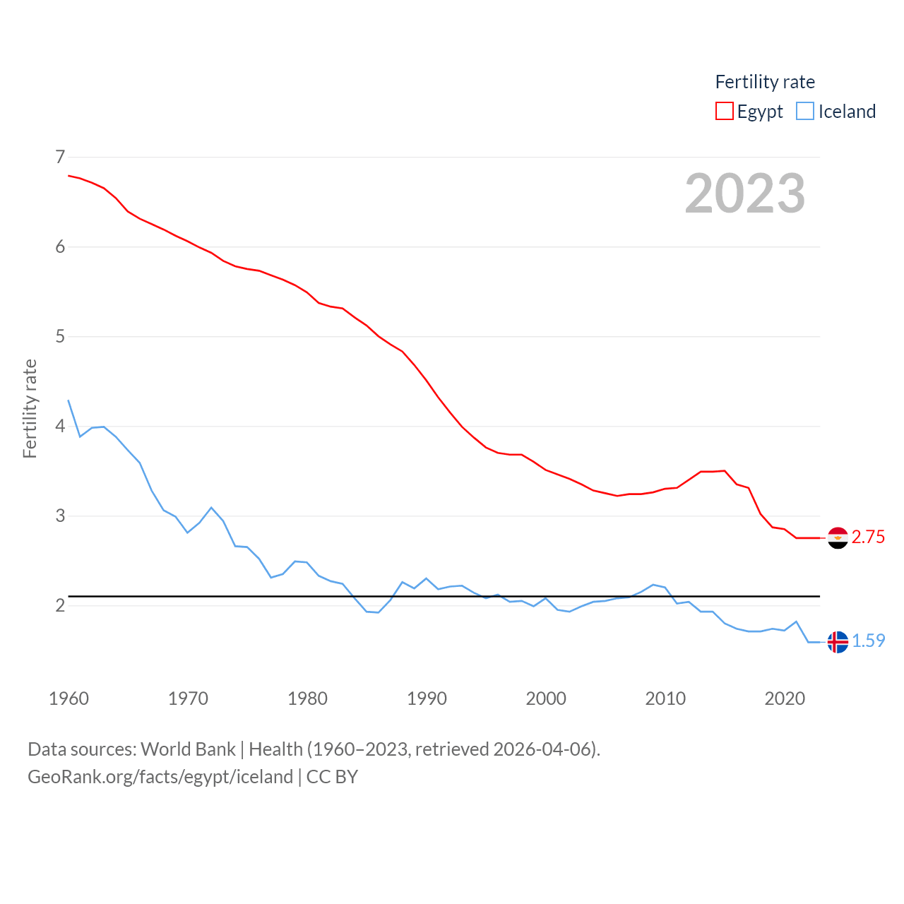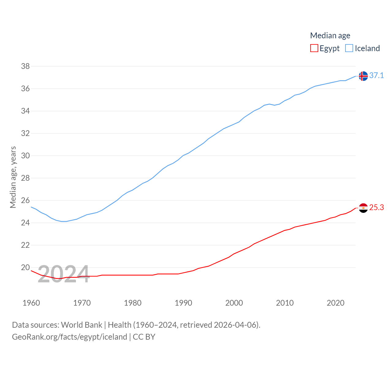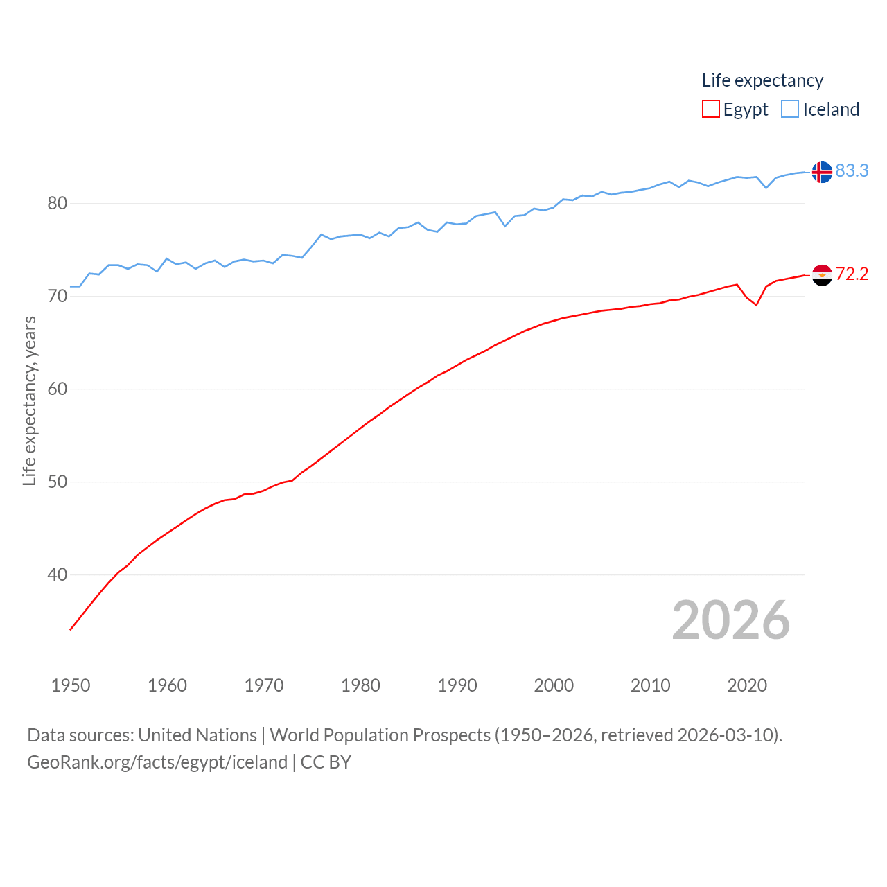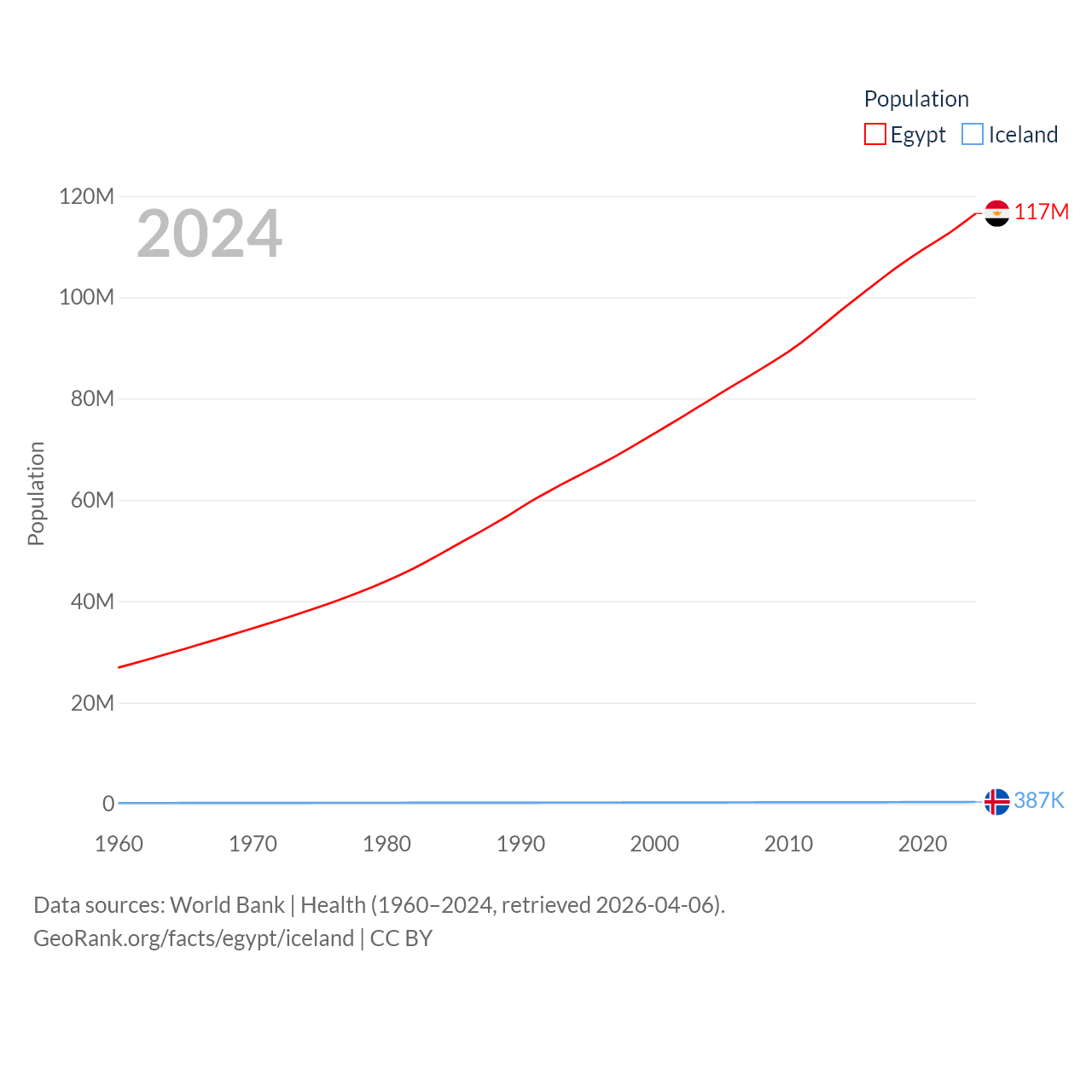 Egypt has a population of 117M (ranked 13/197), compared with 387K in Iceland (ranked 173/197). Egypt's land area is 384,345 sq mi versus 38,931 sq mi for Iceland (ranked 29th vs. 104th).