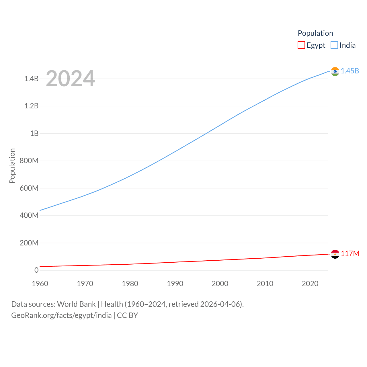 Egypt has a population of 117M (ranked 13/197), compared with 1.45B in India (ranked 1/197). Egypt's land area is 384,345 sq mi versus 1,147,955 sq mi for India (ranked 29th vs. 7th).