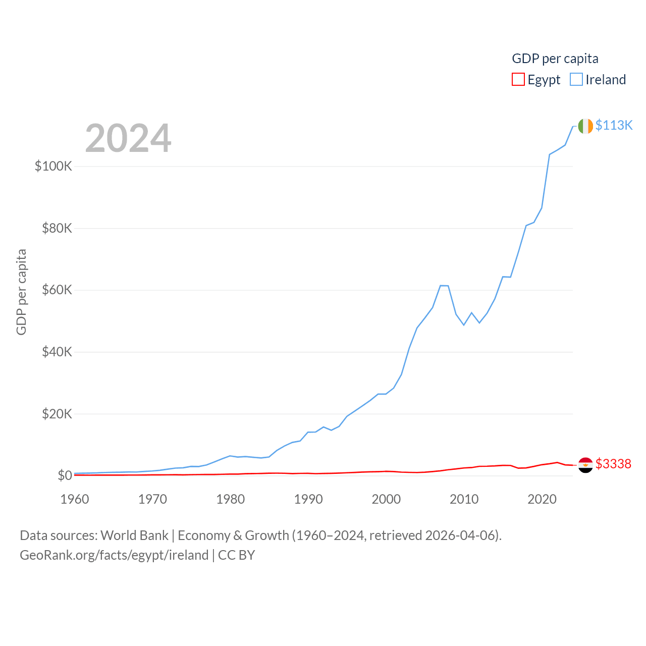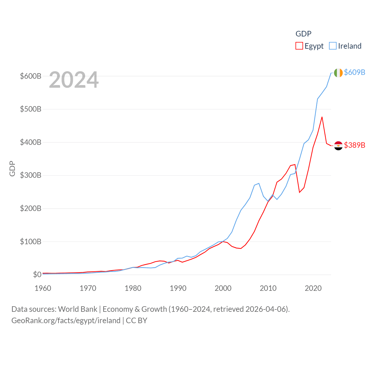 By GDP, Egypt ranks 41/197 ($389B) and Ireland ranks 25/197 ($609B). By GDP per capita, Egypt ranks 138/197 ($3,338), while Ireland ranks 4/197 ($112,895).