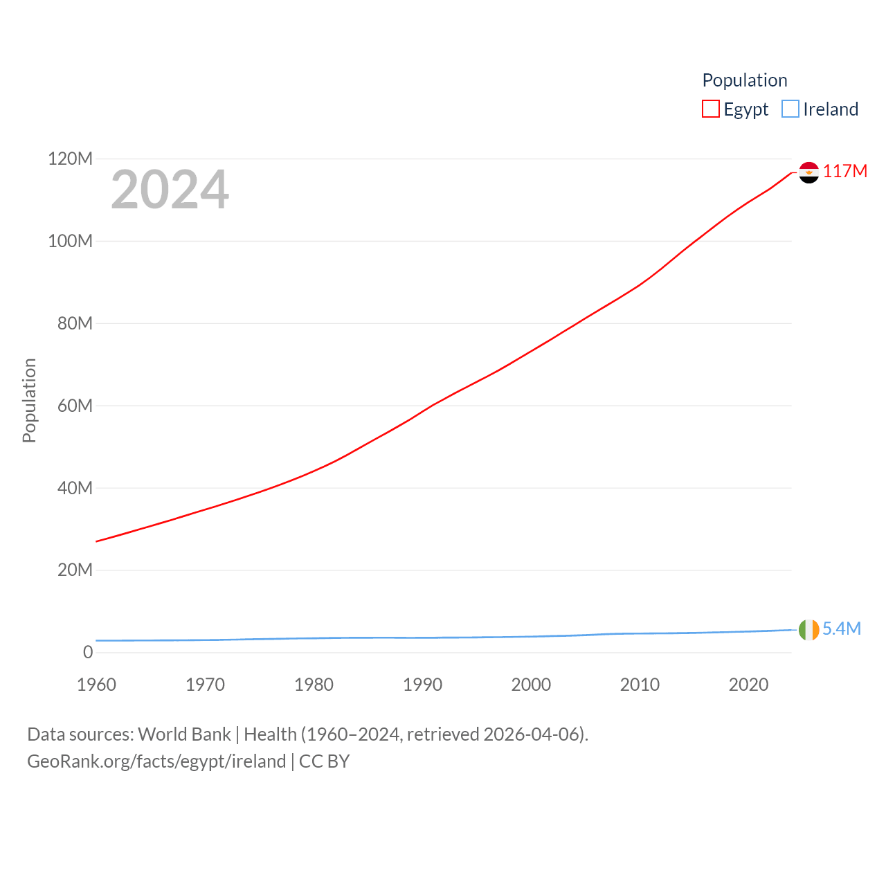 Egypt has a population of 117M (ranked 13/197), compared with 5.4M in Ireland (ranked 120/197). Egypt's land area is 384,345 sq mi versus 26,599 sq mi for Ireland (ranked 29th vs. 119th).