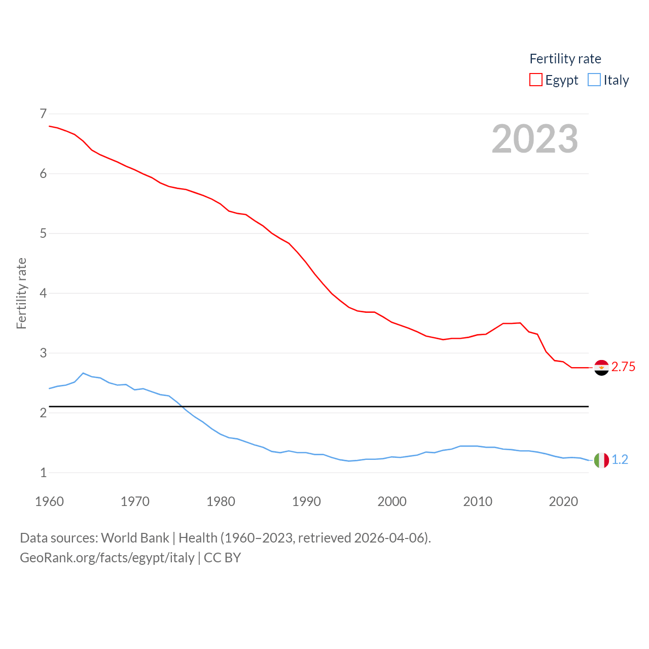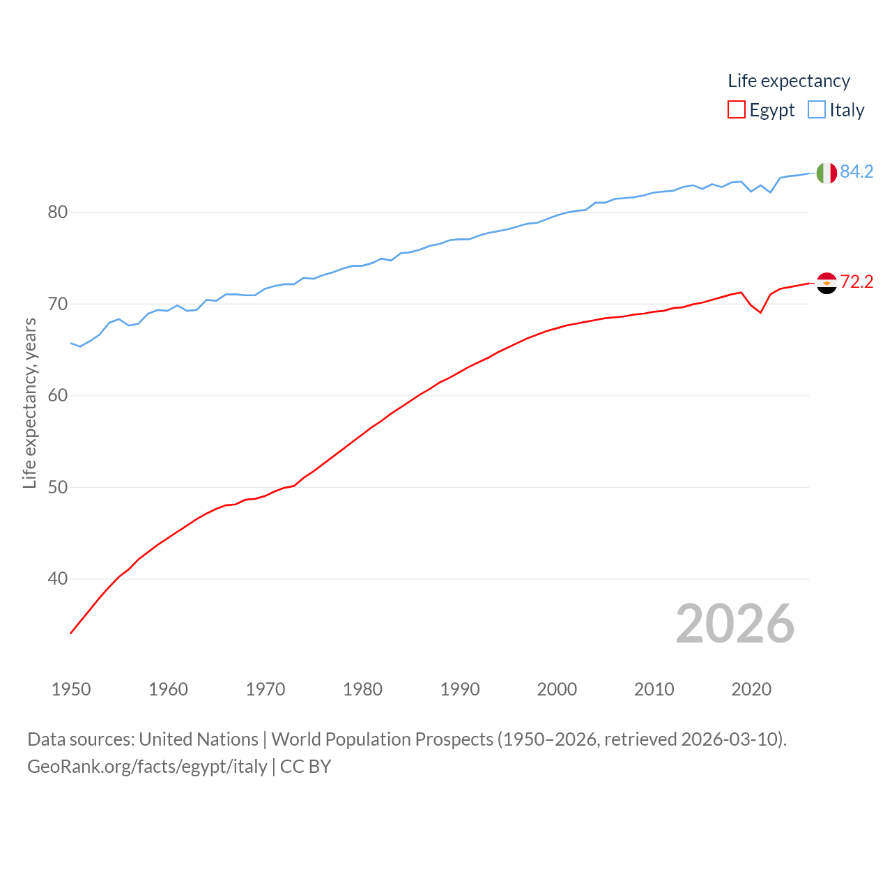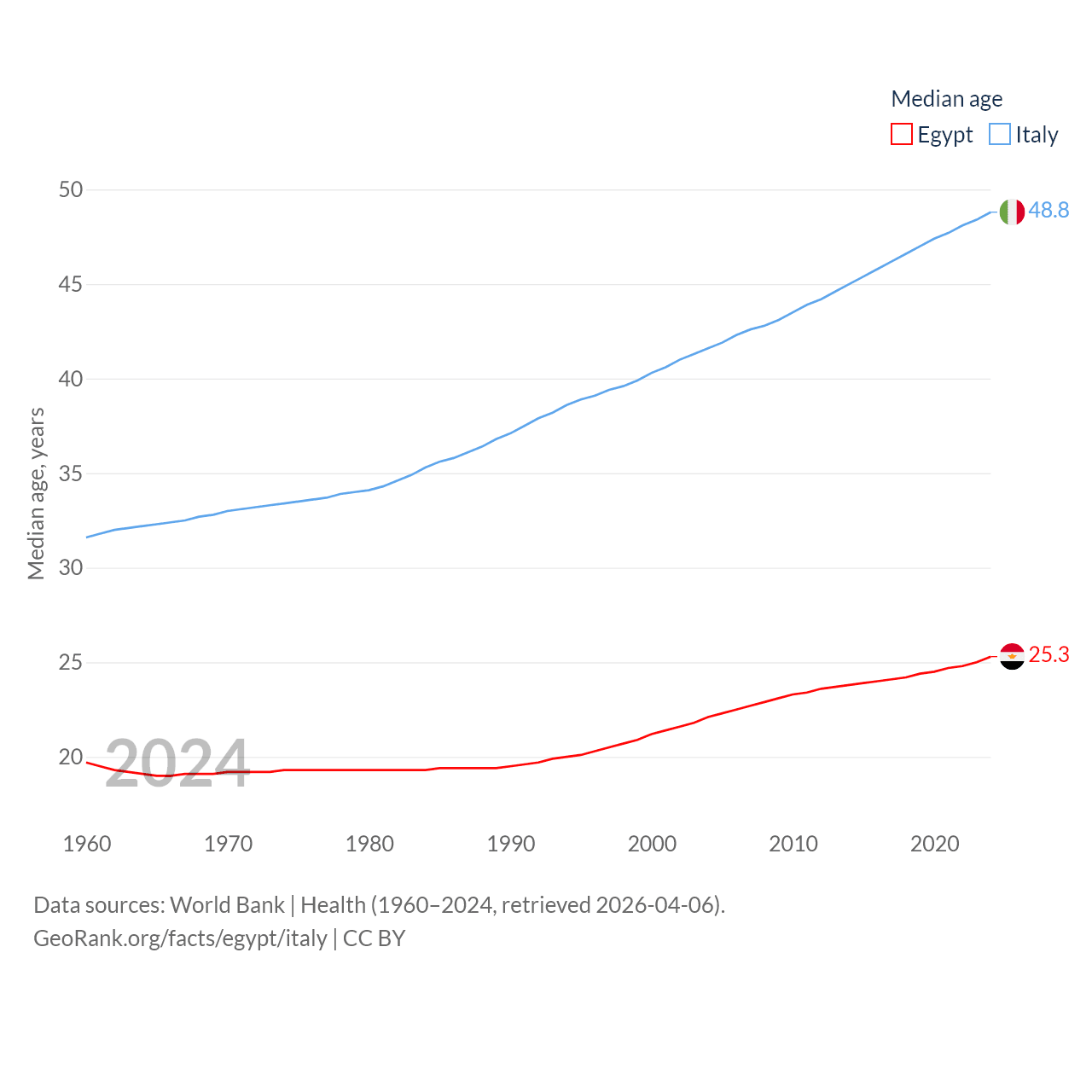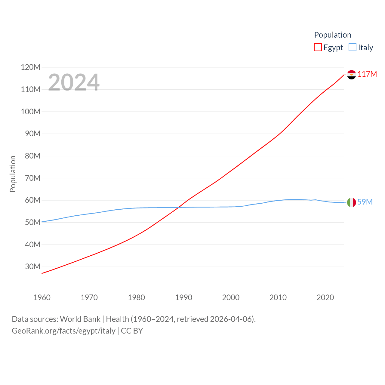 Egypt has a population of 117M (ranked 13/197), compared with 59M in Italy (ranked 25/197). Egypt's land area is 384,345 sq mi versus 114,178 sq mi for Italy (ranked 29th vs. 72nd).