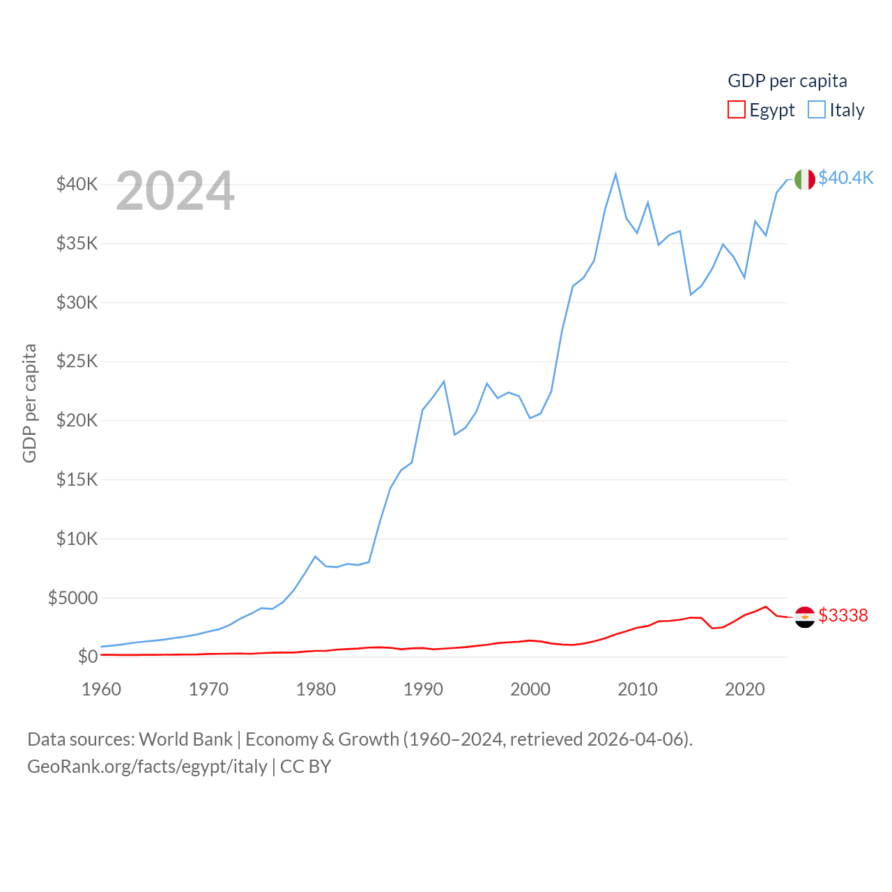 By GDP, Egypt ranks 41/197 ($389B) and Italy ranks 8/197 ($2.38T). By GDP per capita, Egypt ranks 138/197 ($3,338), while Italy ranks 29/197 ($40,385).
