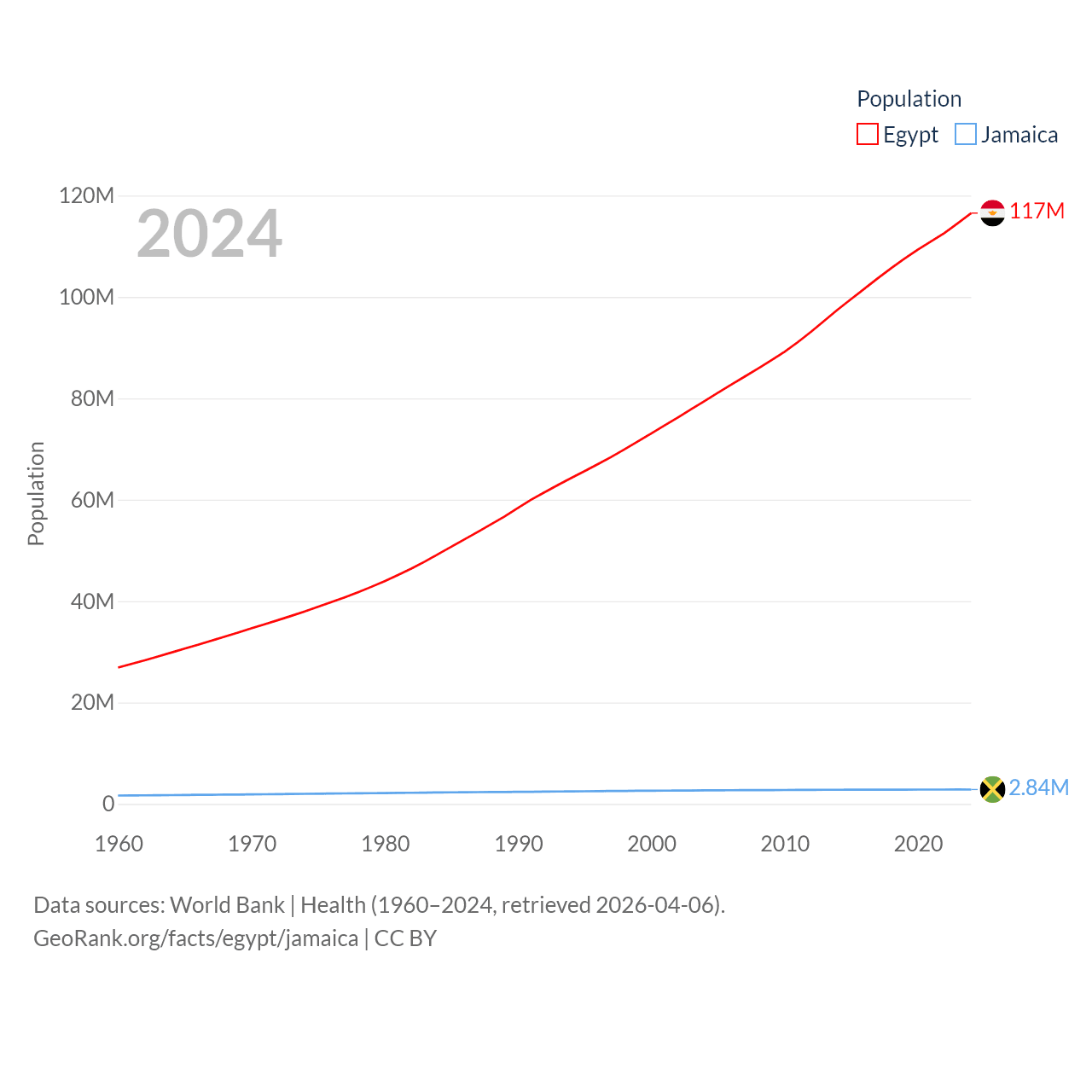 Egypt has a population of 117M (ranked 13/197), compared with 2.84M in Jamaica (ranked 139/197). Egypt's land area is 384,345 sq mi versus 4,181 sq mi for Jamaica (ranked 29th vs. 159th).