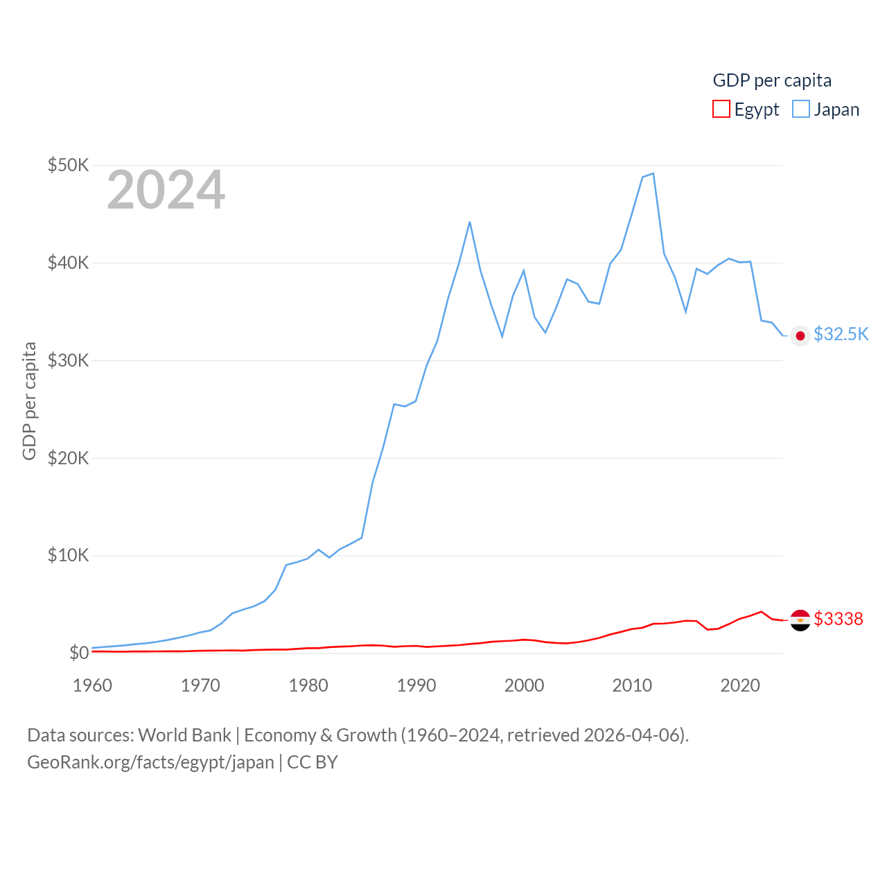 By GDP, Egypt ranks 41/197 ($389B) and Japan ranks 4/197 ($4.03T). By GDP per capita, Egypt ranks 138/197 ($3,338), while Japan ranks 38/197 ($32,487).