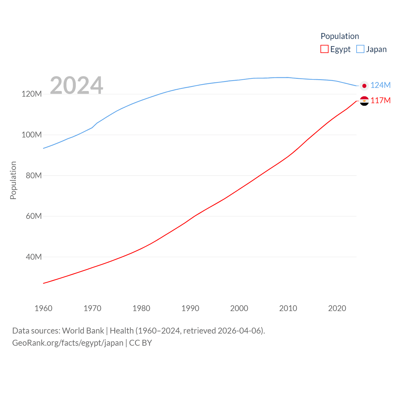 Egypt has a population of 117M (ranked 13/197), compared with 124M in Japan (ranked 12/197). Egypt's land area is 384,345 sq mi versus 140,761 sq mi for Japan (ranked 29th vs. 61st).
