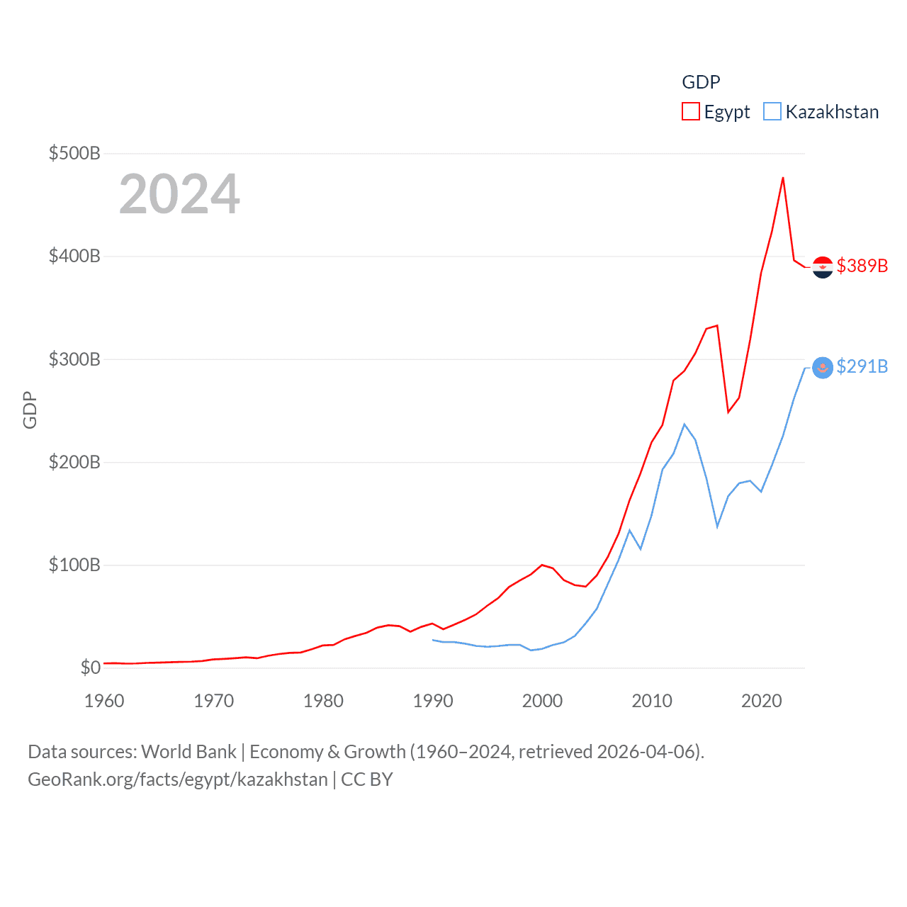 By GDP, Egypt ranks 41/197 ($389B) and Kazakhstan ranks 48/197 ($291B). By GDP per capita, Egypt ranks 138/197 ($3,338), while Kazakhstan ranks 71/197 ($14,155).