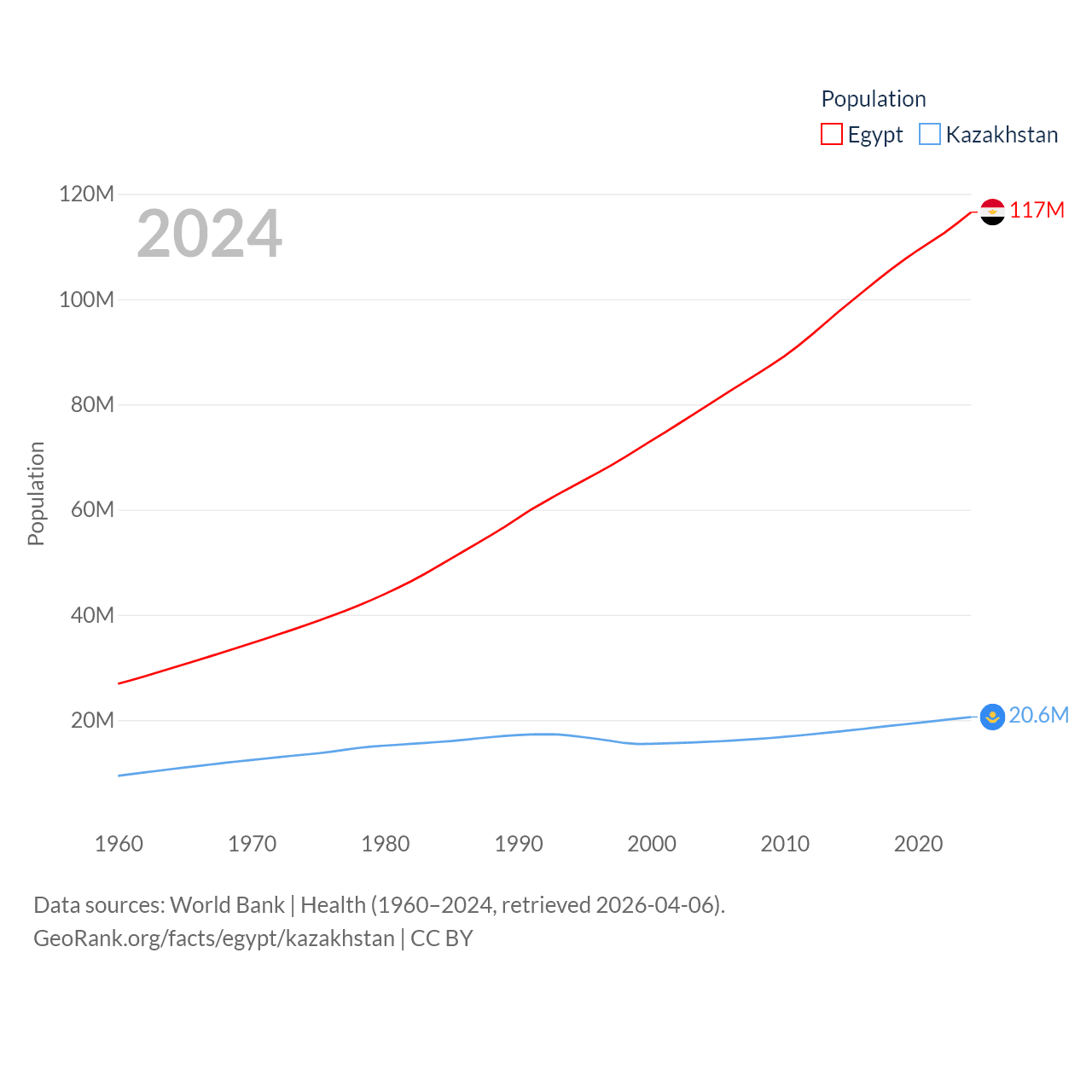 Egypt has a population of 117M (ranked 13/197), compared with 20.6M in Kazakhstan (ranked 64/197). Egypt's land area is 384,345 sq mi versus 1,042,360 sq mi for Kazakhstan (ranked 29th vs. 9th).