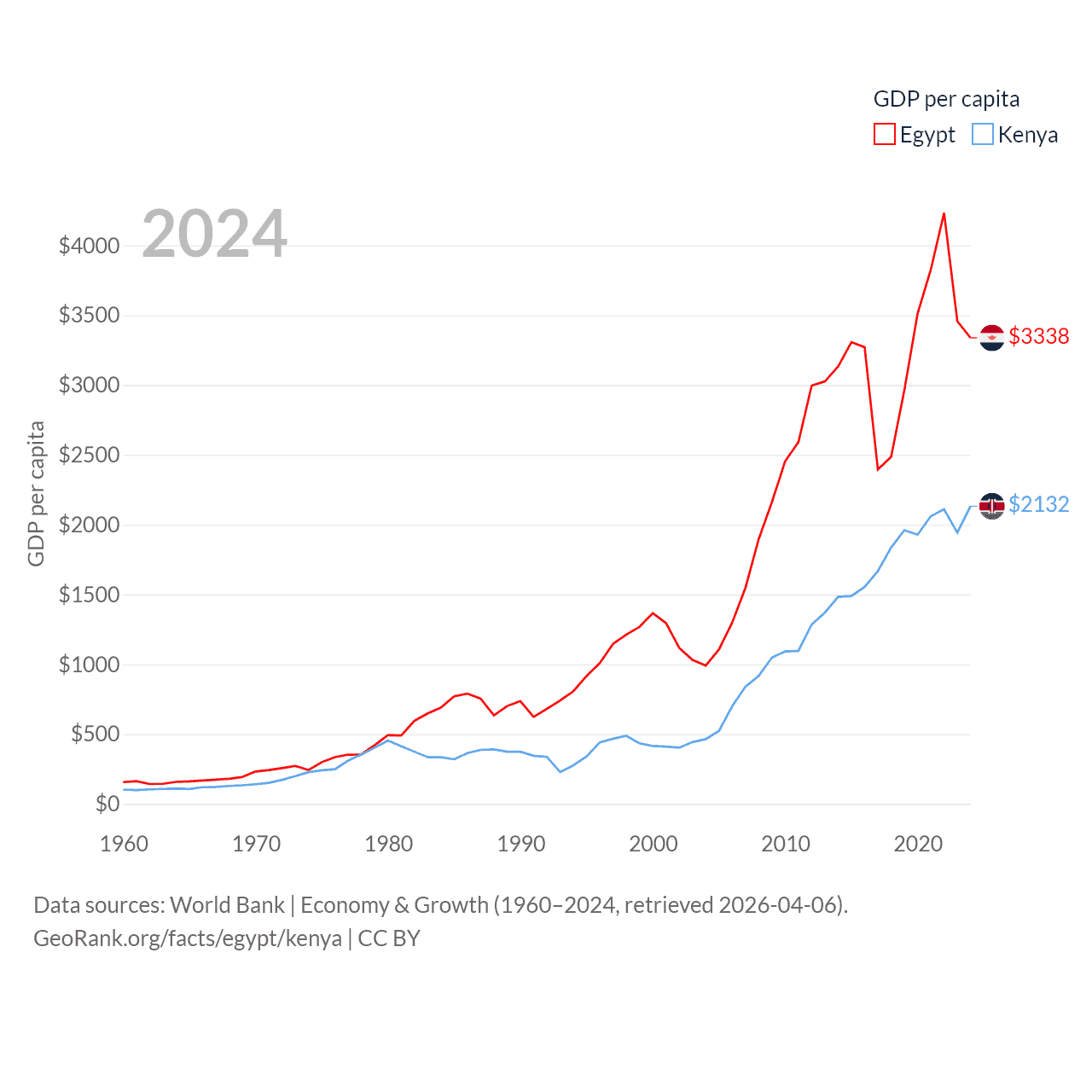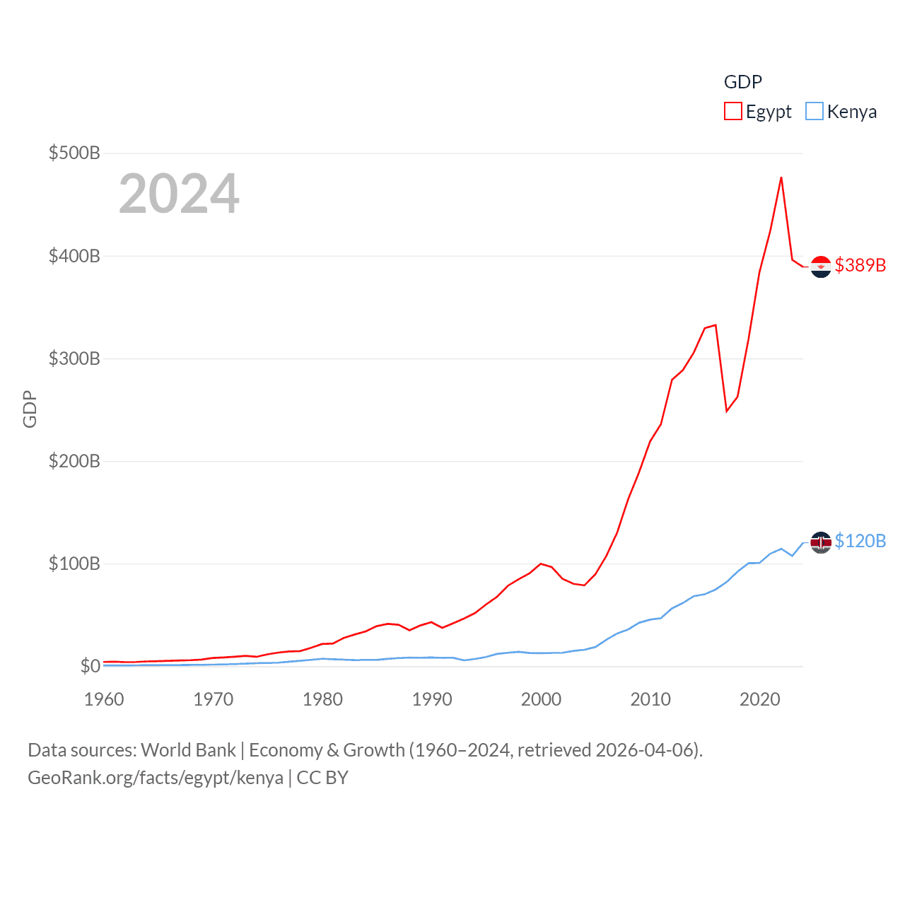 By GDP, Egypt ranks 41/197 ($389B) and Kenya ranks 64/197 ($120B). By GDP per capita, Egypt ranks 138/197 ($3,338), while Kenya ranks 154/197 ($2,132).