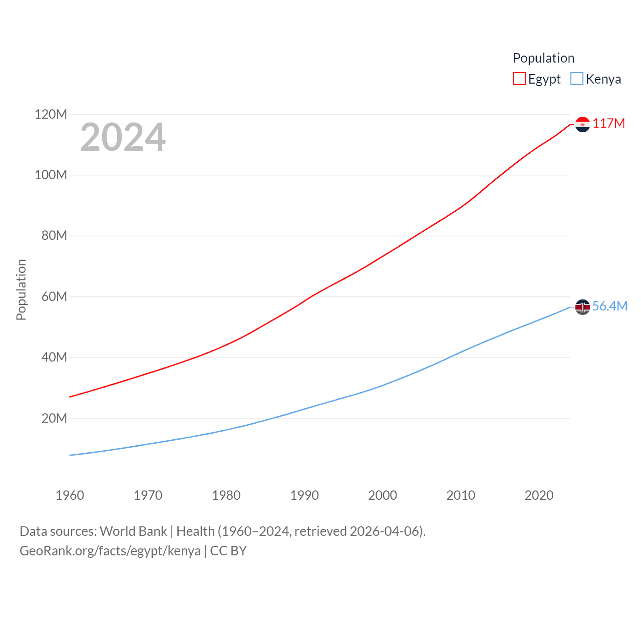 Egypt has a population of 117M (ranked 13/197), compared with 56.4M in Kenya (ranked 26/197). Egypt's land area is 384,345 sq mi versus 224,278 sq mi for Kenya (ranked 29th vs. 45th).