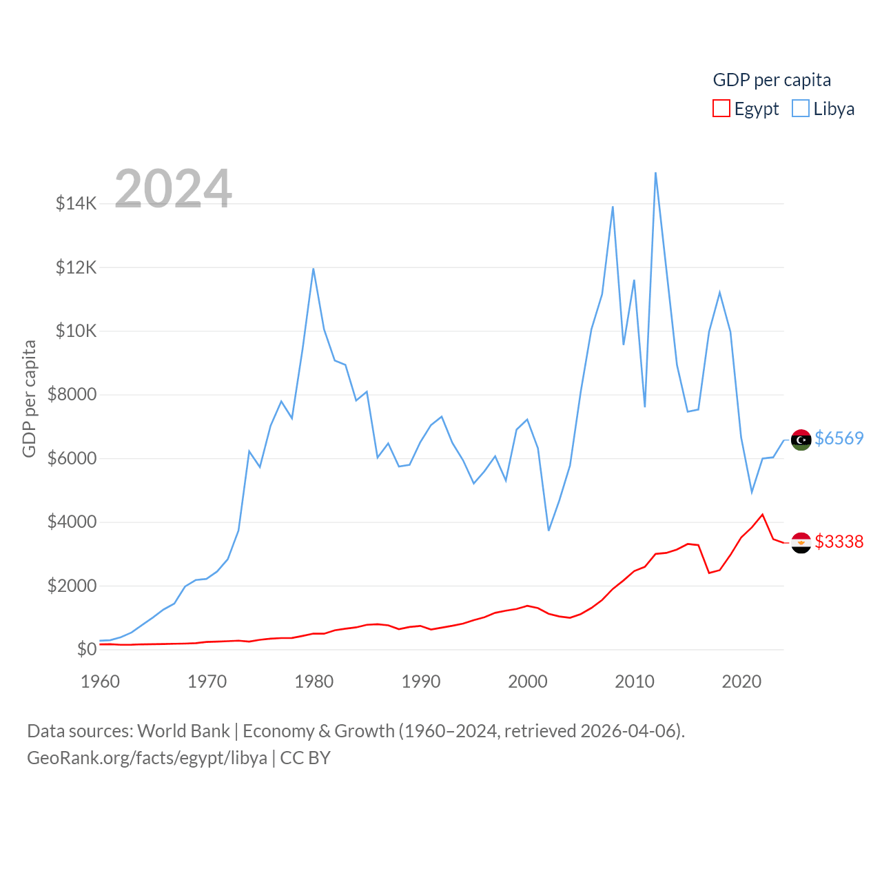 By GDP, Egypt ranks 41/197 ($389B) and Libya ranks 95/197 ($48.5B). By GDP per capita, Egypt ranks 138/197 ($3,338), while Libya ranks 107/197 ($6,569).