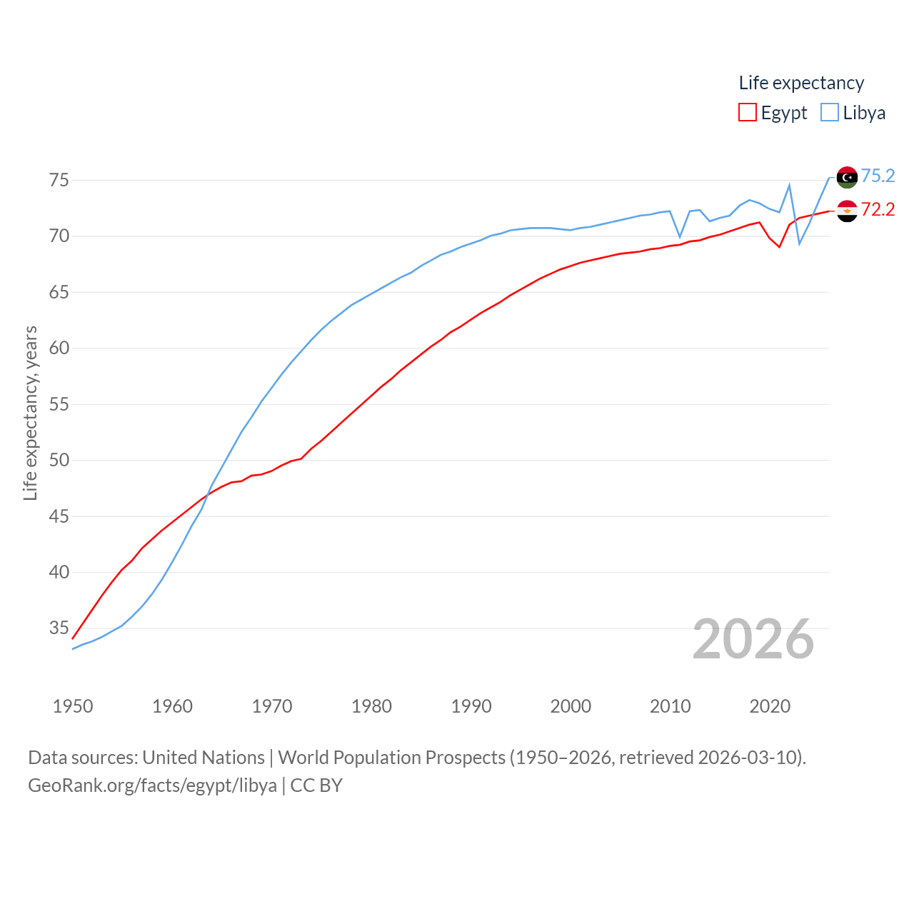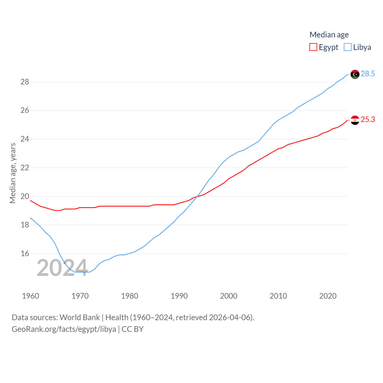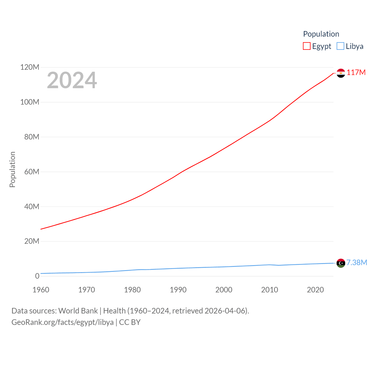 Egypt has a population of 117M (ranked 13/197), compared with 7.38M in Libya (ranked 105/197). Egypt's land area is 384,345 sq mi versus 679,362 sq mi for Libya (ranked 29th vs. 16th).
